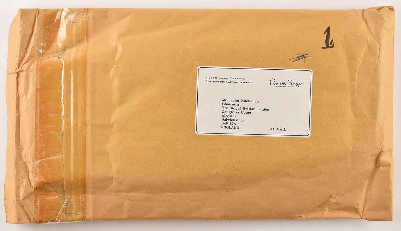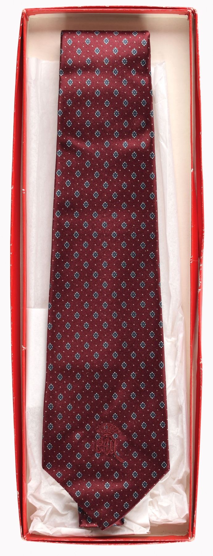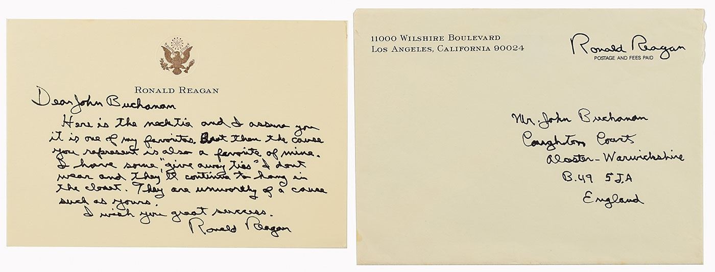Ronald Reagan's personally-owned and -worn maroon Countess Mara 'Sistine Satin' foulard necktie, with accompanying ALS from Reagan on his personal 6.5 x 4.25 stationery card, no date, addressed to John Buchanan, in full: "Here is the necktie and I assure you it is one of my favorites. But then the cause you represent is also a favorite of mine. I have some 'give away ties' I don't wear and they'll continue to hang in the closest. They are unworthy of a cause such as yours. I wish you great success." In very fine condition. Accompanied by the original mailing envelope, addressed in Reagan's own hand, as well as the necktie's original shipping package, both of which feature Reagan's preprinted franking signature.