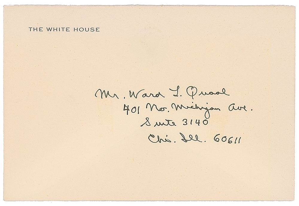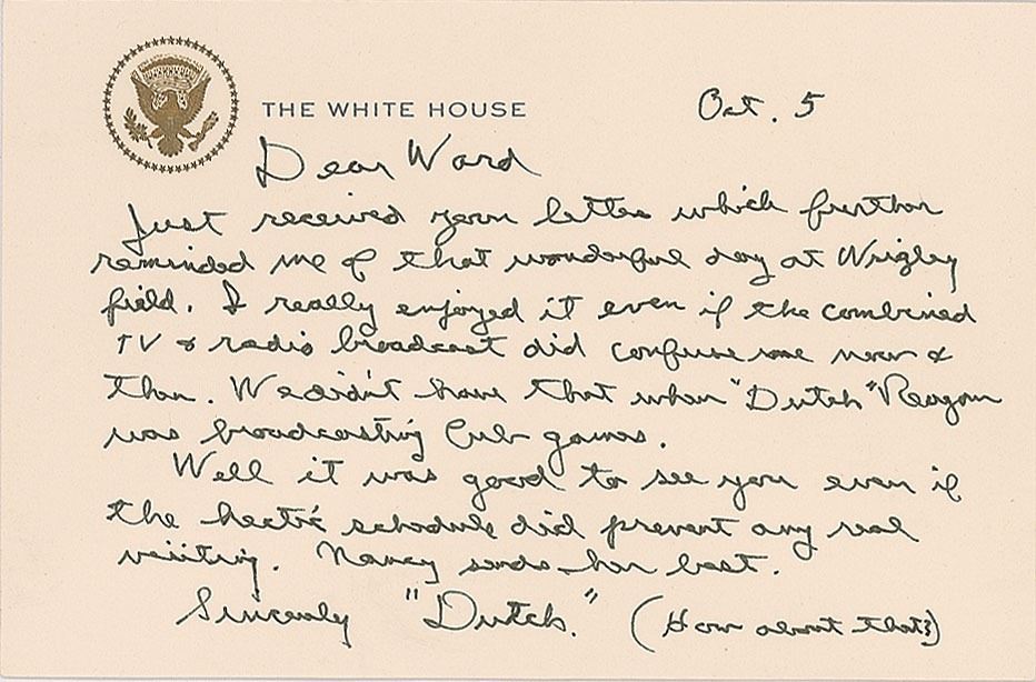 ALS signed “Dutch,” one page, 5.75 x 3.75, White House letterhead, October 5. Letter to WGN president Ward L. Quaal, in full: "Just received your letter which further reminded me of that wonderful day at Wrigley Field. I really enjoyed it even if the combined TV & radio broadcast did confuse me now & then. We didn't have that when 'Dutch' Reagan was broadcasting Cub games. Well it was good to see you even if the hectic schedule did prevent any real visiting. Nancy sends her best." After his informal signature, Reagan adds: "(How about that?)." In very fine condition. Accompanied by the original mailing envelope addressed in Reagan's own hand. As the president of the WGN Continental Broadcast Company, Ward Quaal was one of the top radio broadcasting executives in the country. He met Reagan when the future president was acting in radio commercials for the WGN radio station in Chicago, and the two formed a lasting correspondence in 1967 after Reagan became governor of California.
