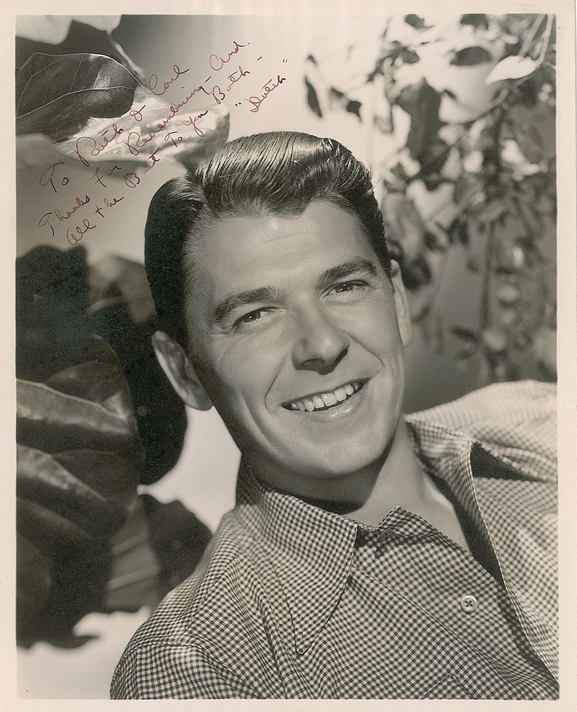 Vintage matte-finish 8 x 10 photo of Ronald Reagan as a young Hollywood actor, signed and inscribed in fountain pen, "To Ruth & Carl, Thanks for remembering—and all the best to you both—'Dutch.'” In fine condition, with rippling to the top edge.