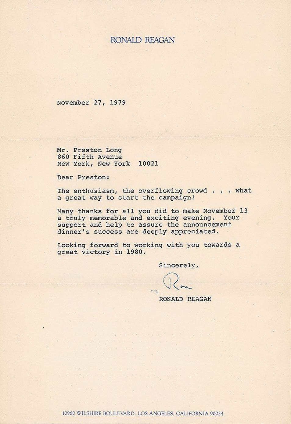 TLS signed “Ron,” one page, 7.25 x 10.5, personal letterhead, November 27, 1979. Letter to Preston Long, in full: "The enthusiasm, the overflowing crowd… what a great way to start the campaign! Many thanks for all you did to make November 13 a truly memorable and exciting evening. Your support and help to assure the announcement dinner's success are deeply appreciated. Looking forward to working with you towards a great victory in 1980." In fine condition.