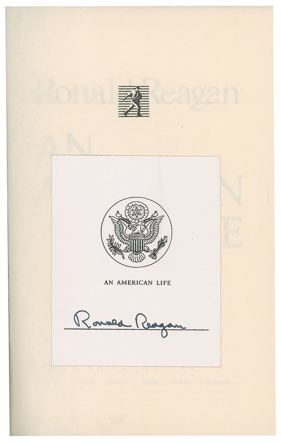 Signed book: An American Life. First edition. NY: Simon & Schuster, 1990. Hardcover with dust jacket, 6.5 x 9.5, 748 pages. Signed by Ronald Reagan in black ink on a bookplate affixed to the half-title page. In fine condition, with a vertical wrinkle to the bookplate, not touching the signature.