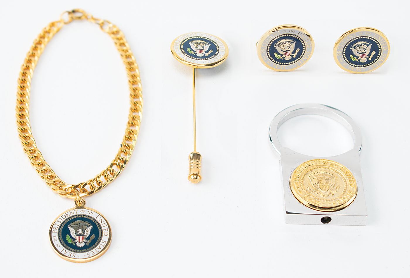 Four presidential seal accessory gifts from the administration of Ronald Reagan, all in their original boxes gilt-stamped on the lids with Reagan's facsimile signature. Includes: a charm bracelet; a stickpin; a pair of cufflinks; and a keyring. In overall fine condition, with surface loss to the lid of the cufflink box.