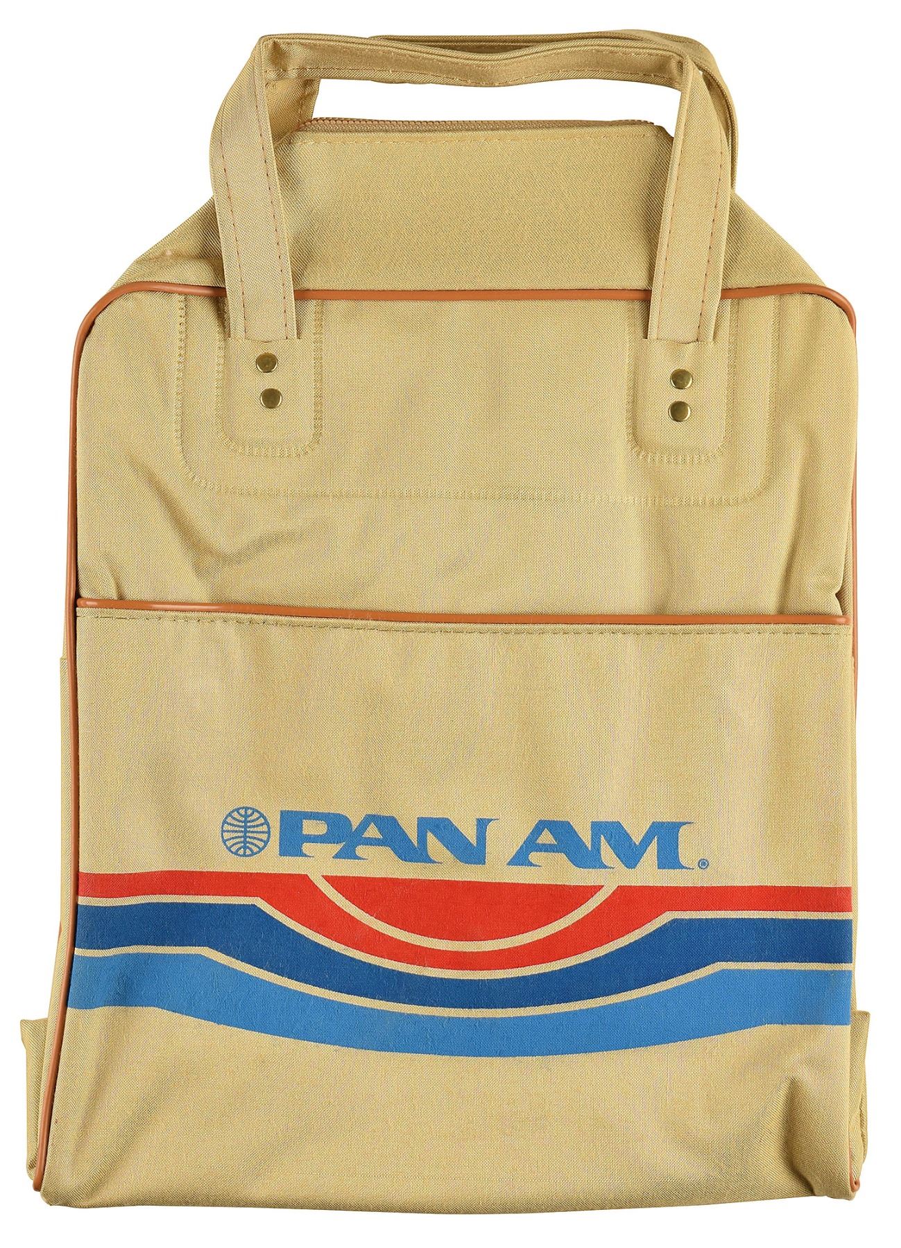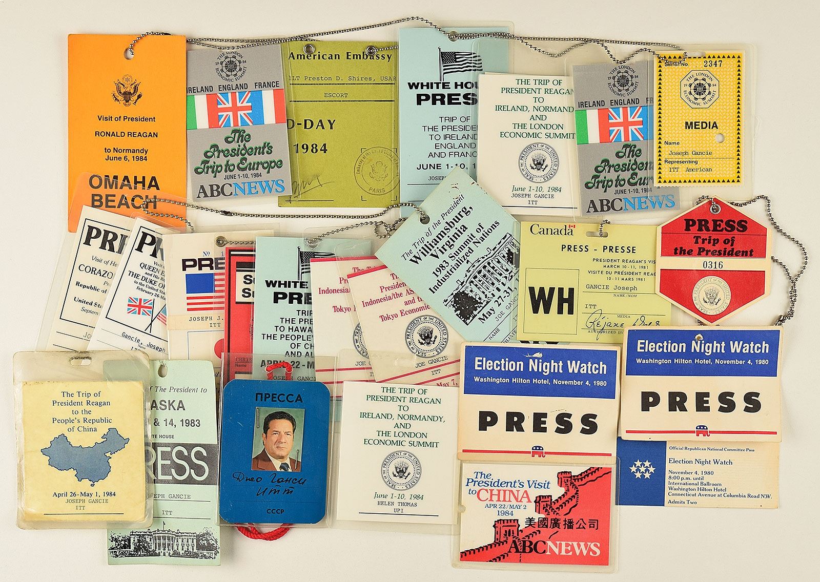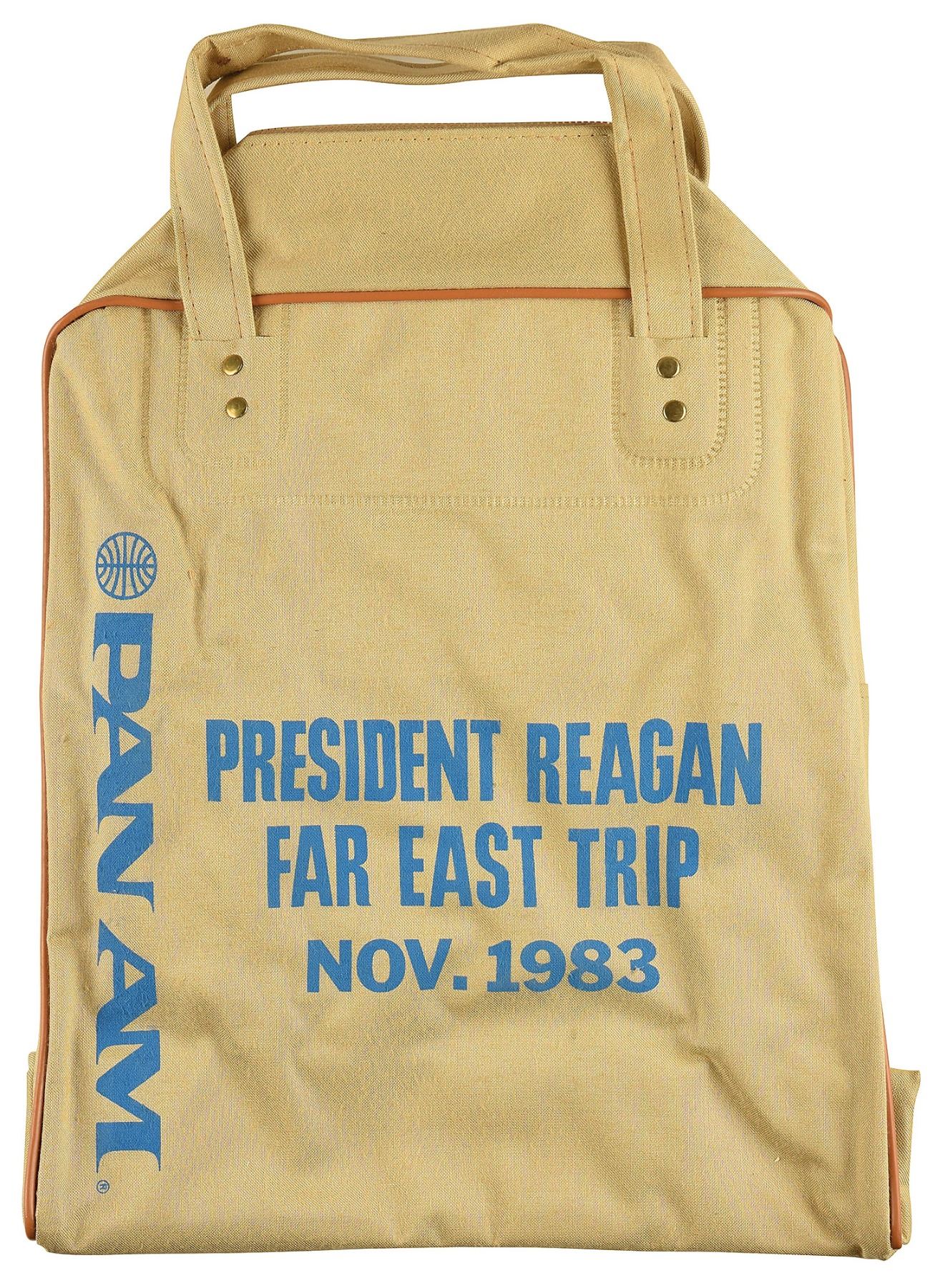Collection of items associated with the trips of President Ronald Reagan, including: a beige Pan Am luggage bag, featuring blue text: "President Reagan, Far East Trip, Nov. 1983"; and an assortment of 26 press badges and passes for Reagan's trips and events, including trips to Ireland, Normandy (Omaha Beach), the London Economic Summit, Indonesia, Tokyo Economic Summit, China, Canada, Alaska, Election Night Watches, and elsewhere. In overall very good to fine condition.