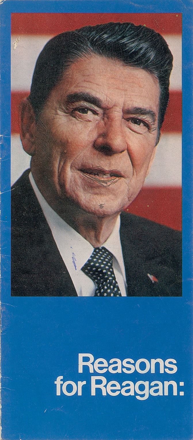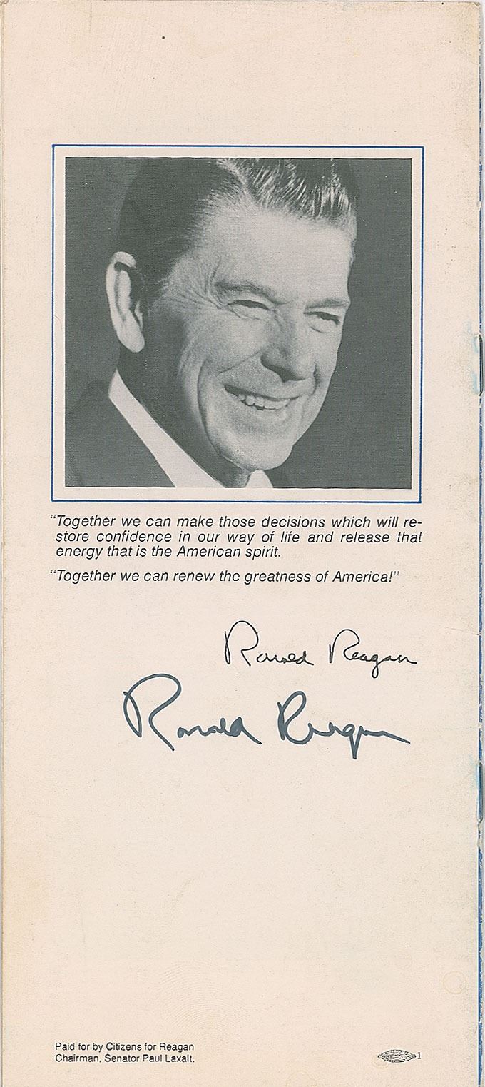 Campaign brochure entitled "Reasons for Reagan," six pages, 4 x 9, signed on the back in black felt tip, below a facsimile signature. In very good to fine condition, with pencil doodles to Reagan's face on the front cover in an unknown hand. Accompanied by a collector's note stating that it was signed at the Stoddard Hotel in La Crosse, Wisconsin.