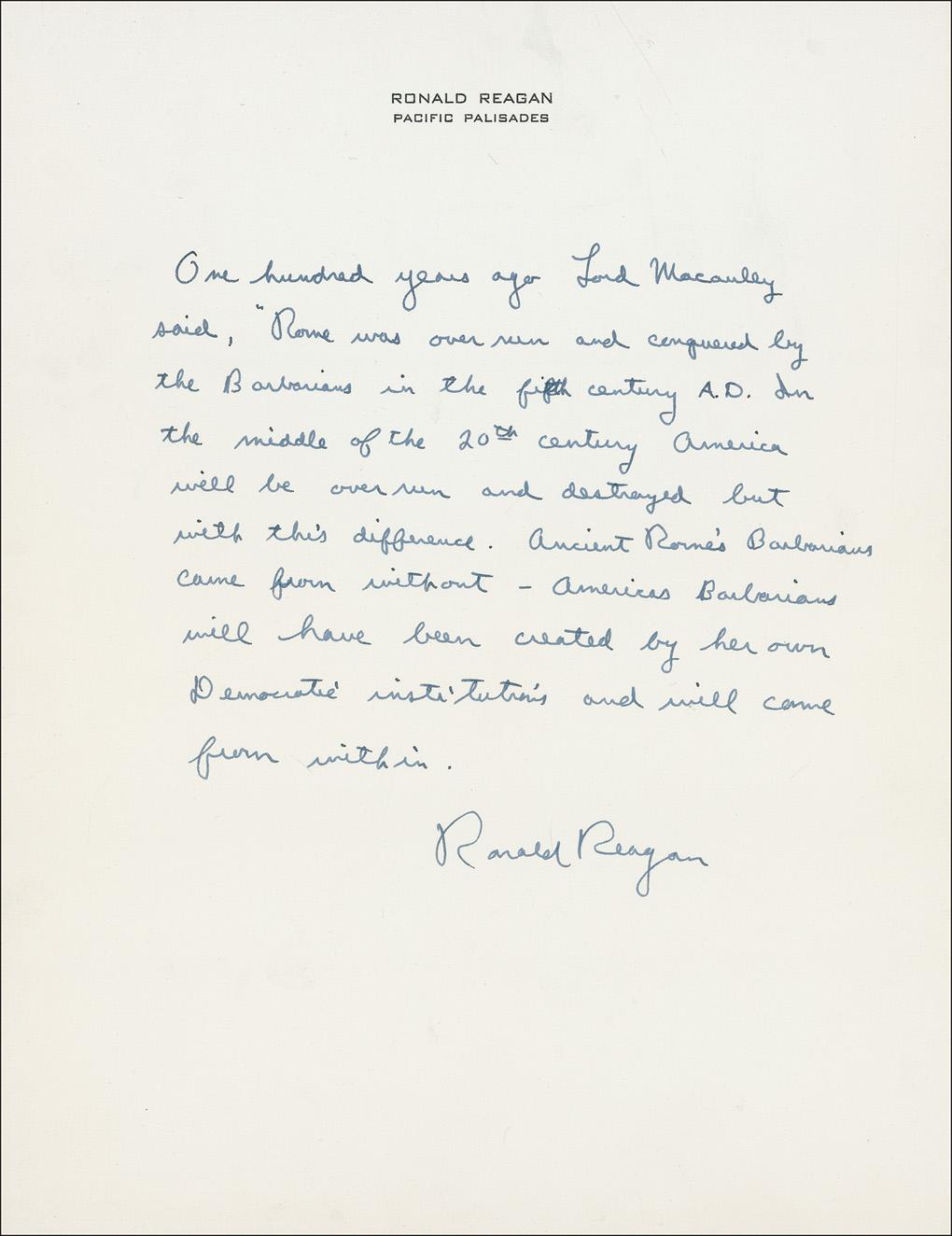 Extraordinary AQS, signed “Ronald Reagan,” one page on an 8.5 x 11 sheet of his personal letterhead, Pacific Palisades, no date [circa 1965]. In full: “One hundred years ago Lord Macauley said, ‘Rome was over run and conquered by the Barbarians in the fifth century A.D.’ In the middle of the 20th century America will be over run and destroyed but with this difference. Ancient Rome’s Barbarians came from without—Americas Barbarians will have been created by her own Democratic institutions and will come from within.” Accompanied by the original mailing envelope, addressed in Reagan’s hand. In fine, clean condition, with a small crease to top margin through letterhead.