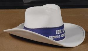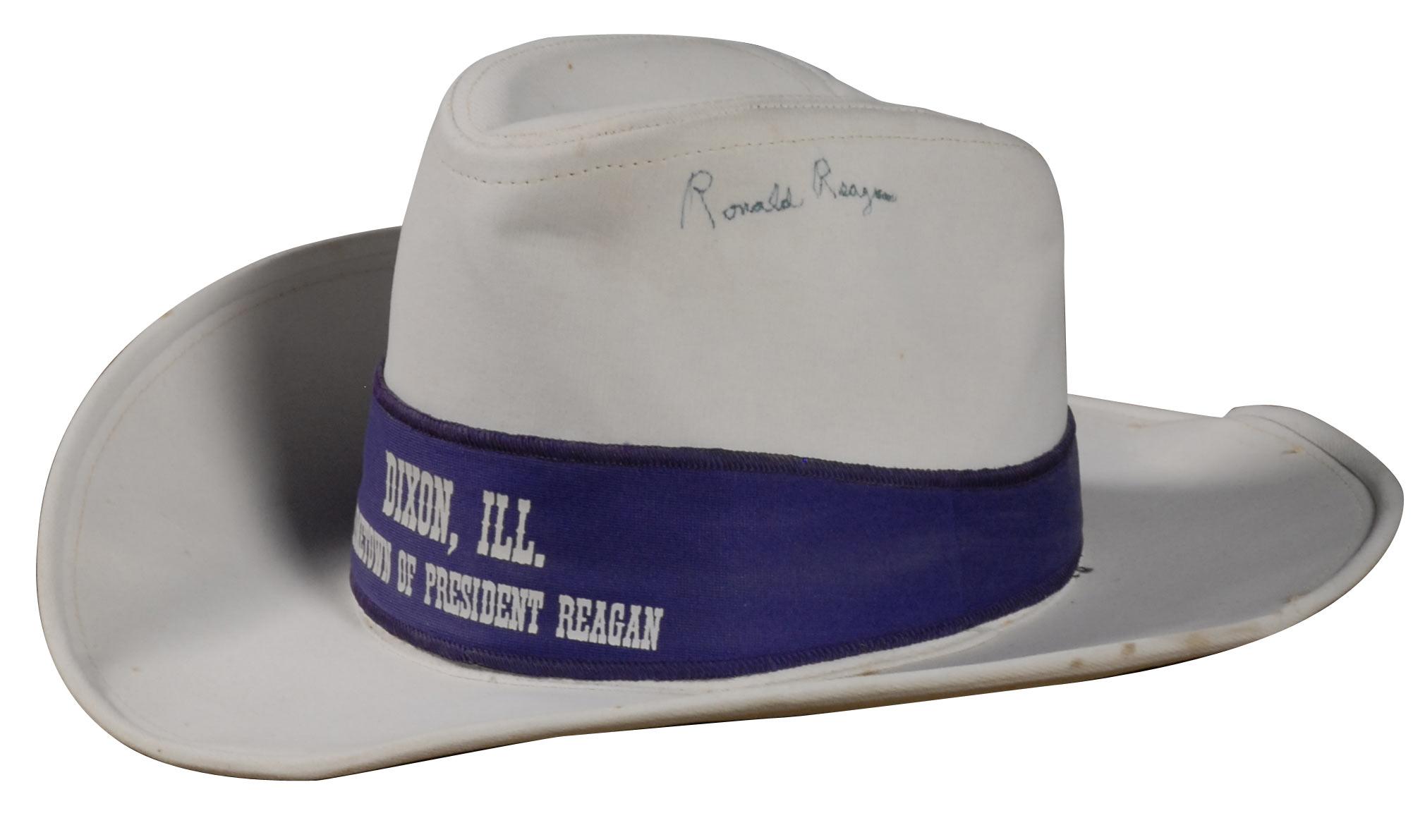 White cowboy hat, bearing a purple hat band honoring Reagan’s hometown of Dixon, Illinois, signed on the side in blue felt tip by Reagan. Accompanied by a letter of provenance from Ken Wendland, who states the “hat was signed while I…visited President Reagan at his office on October 13, 1989. The autograph is verified by the photo taken in his office on October 13, 1989.” Also accompanied by the aforementioned photo, showing Reagan with Wendland and his family, with the hat in Wendland’s hand. In fine condition, with some expected light spreading of ink due to nature of material, and some light spotting to hat. Pre-certified PSA/DNA and RRAuction COA.