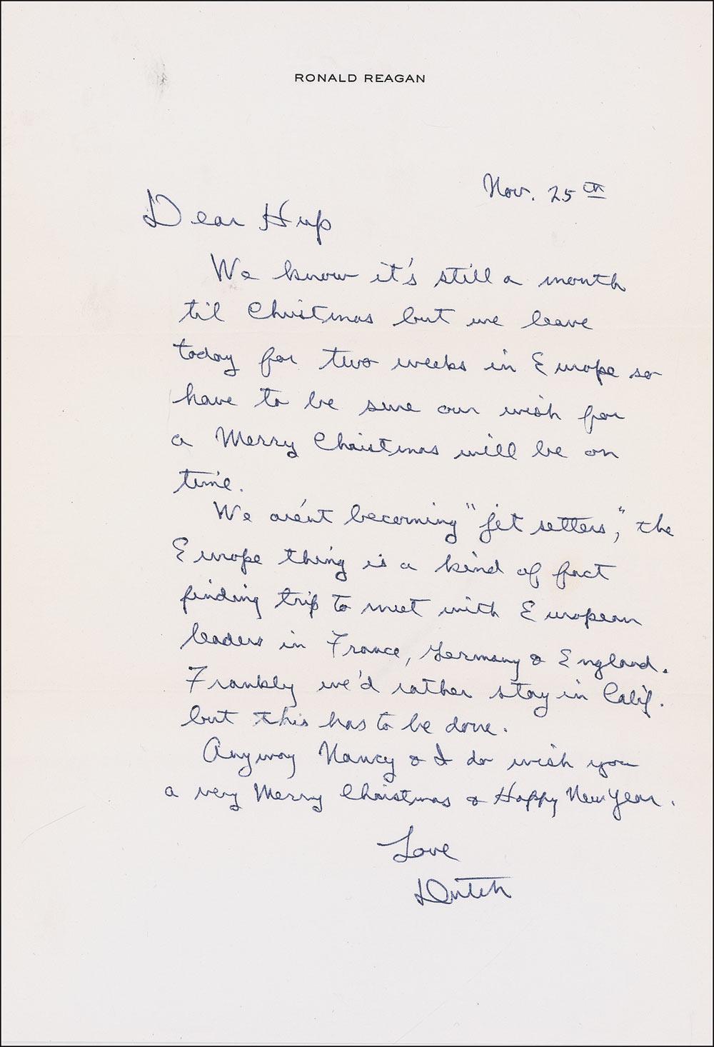 ALS signed “Dutch,” one page, 7.25 x 10.5, personal letterhead, November 25. Letter to his longtime friend Lydia “Hup” MacArthur. In full: “We know it’s still a month til Christmas but we leave today for two weeks in Europe so have to be sure our wish for a Merry Christmas will be on time. We aren’t becoming ‘jet setters,’ the Europe thing is a kind of fact finding trip to meet with European leaders in France, Germany, and England. Frankly we’d rather stay in Calif. but this has to be done. Anyway Nancy & I do wish you a very Merry Christmas & Happy New Year.” Accompanied by the original mailing envelope, postmarked November 25, 1978. Lydia Hupfer “Hup” MacArthur was the widow of Pete MacArthur, program director of WOC in Davenport, Iowa. In 1932, MacArthur had given a then 21 year-old Reagan his first job as a sports announcer. They would remain friends until her passing at the age of 102 in 1995. In fine condition. Pre-certified PSA/DNA and RRAuction COA.