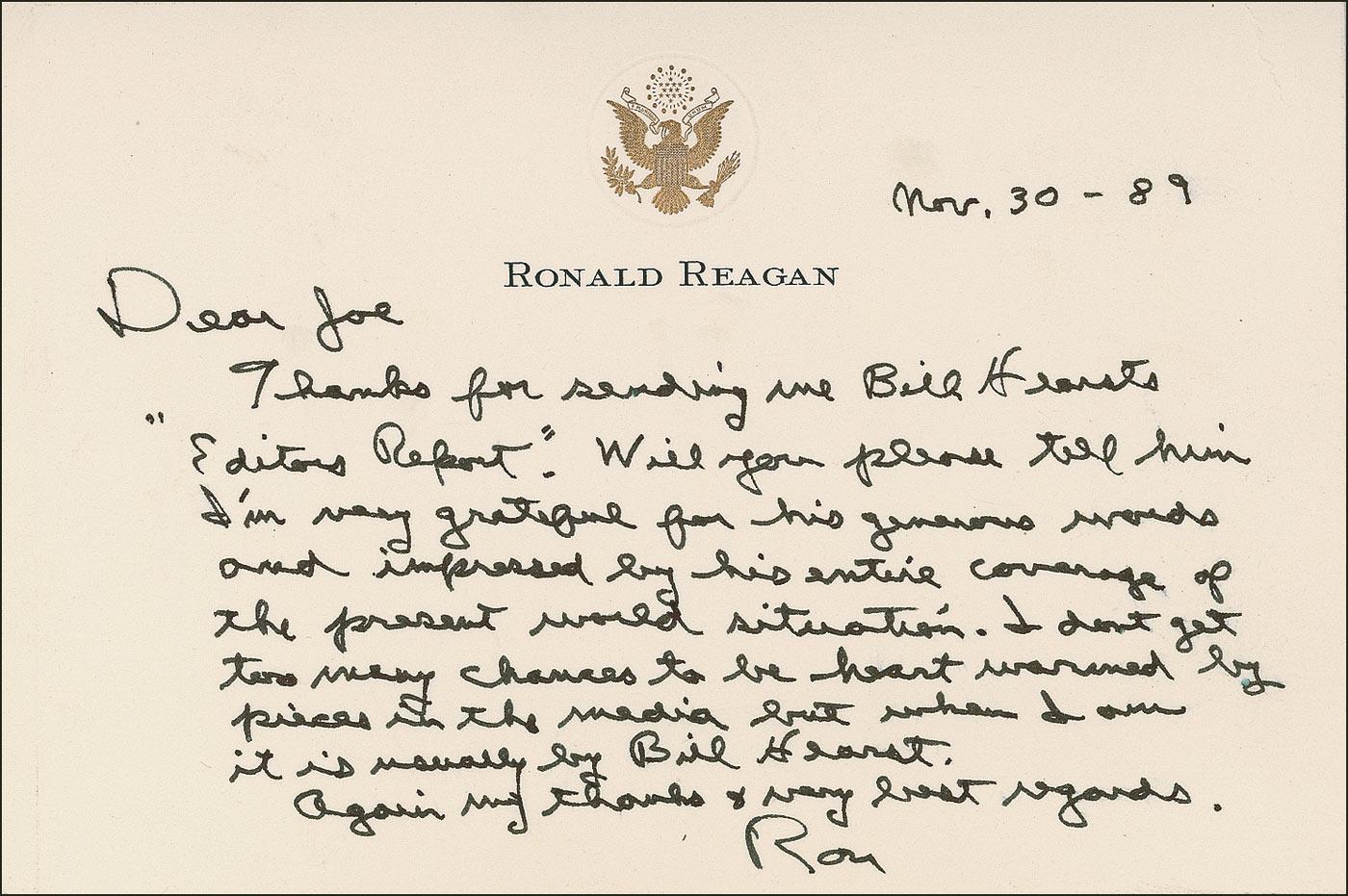 ALS signed “Ron” on his gold-embossed 6.25 x 4.25 personal notecard, November 30, 1989. Reagan writes to Joseph Kingsbury-Smith. In full: “Thanks for sending me Bill Hearst’s ‘Editors Report.’ Will you please tell him I’m very grateful for his generous words and impressed by his entire coverage of the present world situation. I don’t get too many chances to be heart warmed by pieces in the media but when I am it is usually by Bill Hearst.” In very fine condition.