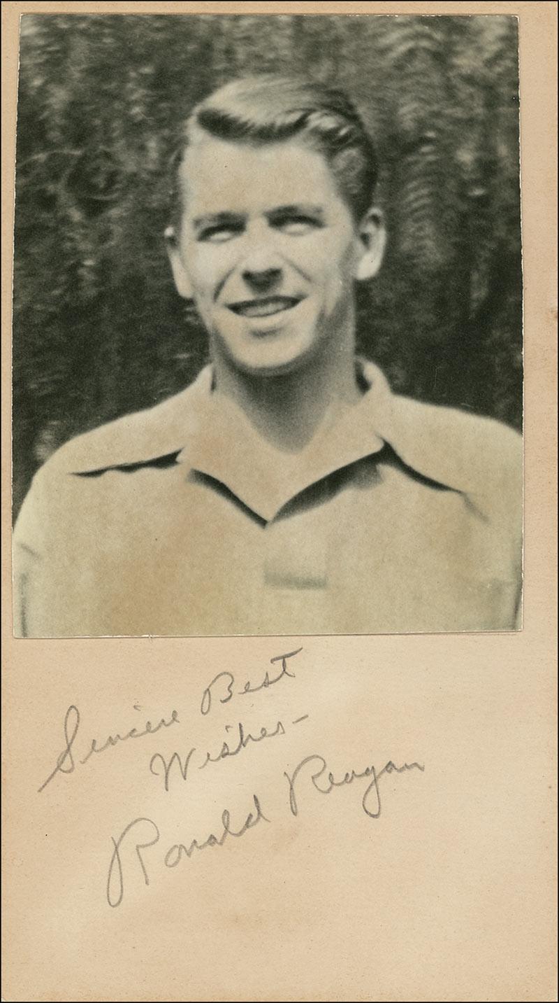 Early pencil signature, “Sincere Best Wishes– Ronald Reagan,” at the bottom of an off-white 3.5 x 6.5 card. In very good condition, with light irregular overall toning and light soiling. Accompanying is a 3.25 x 4 photo designed to displayed with the signature. RRAuction COA.