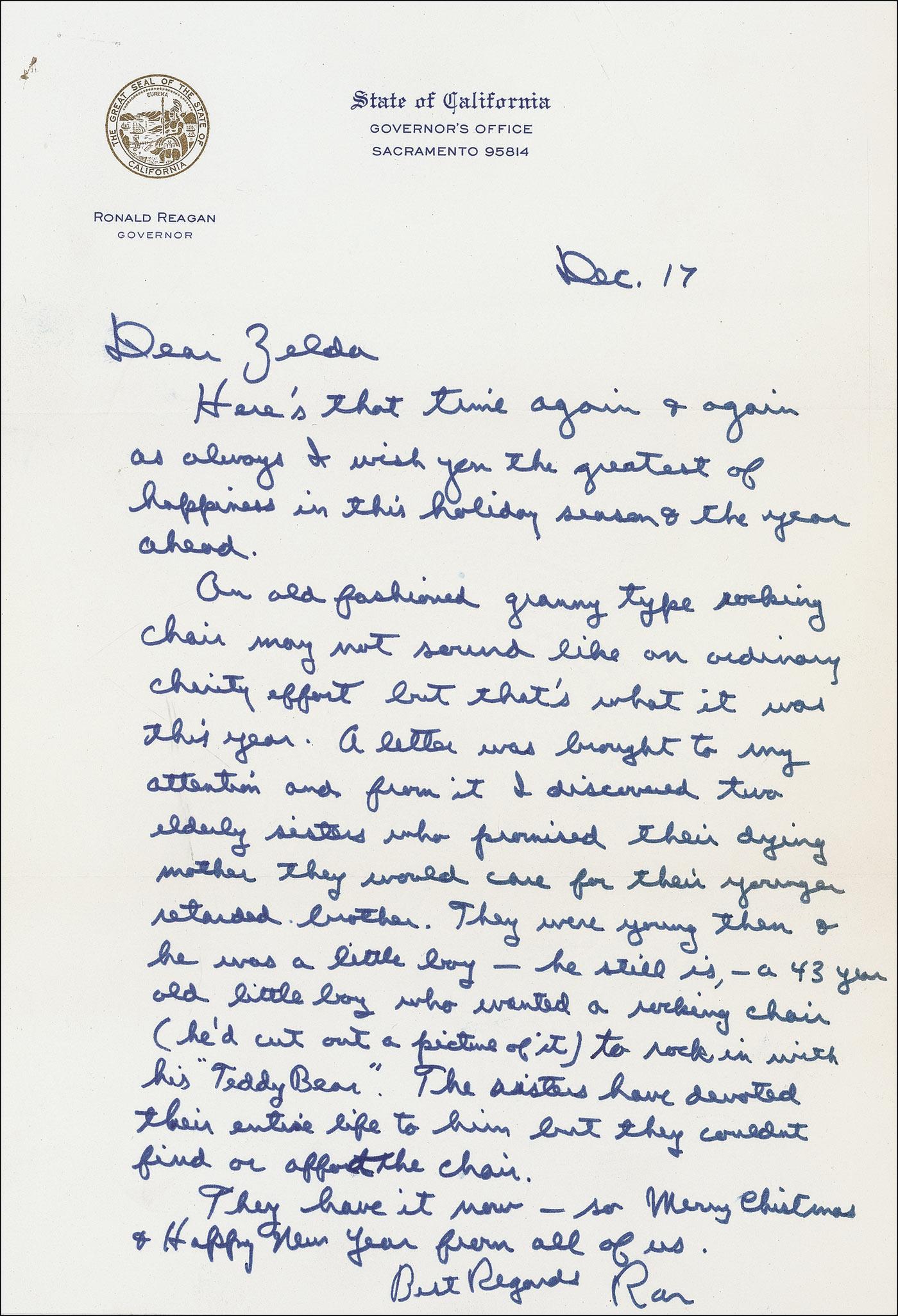 ALS signed “Ron,” one page, 7.25 x 10.5, State of California letterhead (watermarked with the state seal), Sacramento, December 17. Letter written to Zelda. In full: “Here’s that time again & again as always I wish you the greatest of happiness in this holiday season & the year ahead. An old fashioned granny type rocking chair may not sound like an ordinary charity effort but that’s what it was this year. A letter was brought to my attention and from it I discovered two elderly sisters who promised their dying mother they would care for their younger retarded brother. They were young then & he was a little boy—he still is—a 43 year old little boy who wanted a rocking chair (he’d cut out a picture of it) to rock in with his ‘Teddy Bear.’ The sisters have devoted their entire life to him but they couldn’t find or afford the chair. They have it—so Merry Christmas & Happy New Year from all of us.” In fine condition, with a couple of staple holes to top left corner. Accompanied by a photocopy of a note, left by California Highway Patrol officer Dale Role, on behalf of the Reagans which was delivered with the chair to the sisters.