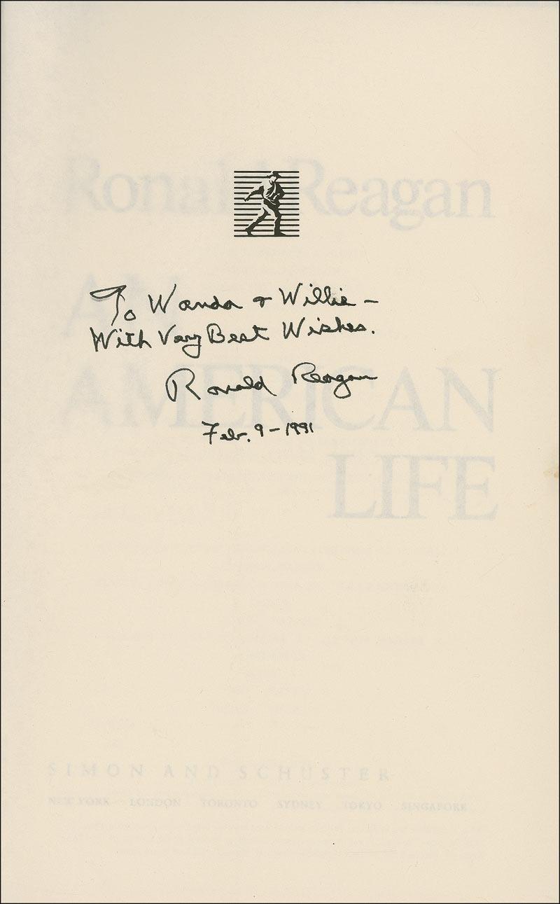 Signed book: An American Life. Later printing. NY: Simon and Schuster, 1990. Hardcover with dustjacket, 6.5 x 9.5, 748 pages. Signed and inscribed in black felt tip on the second free end page, “To Wanda & Willie—With very best wishes. Ronald Reagan, Feb. 9, 1991.” In fine condition, with a few spots of soiling on the first two end pages and small tear to top of dustjacket spine.
