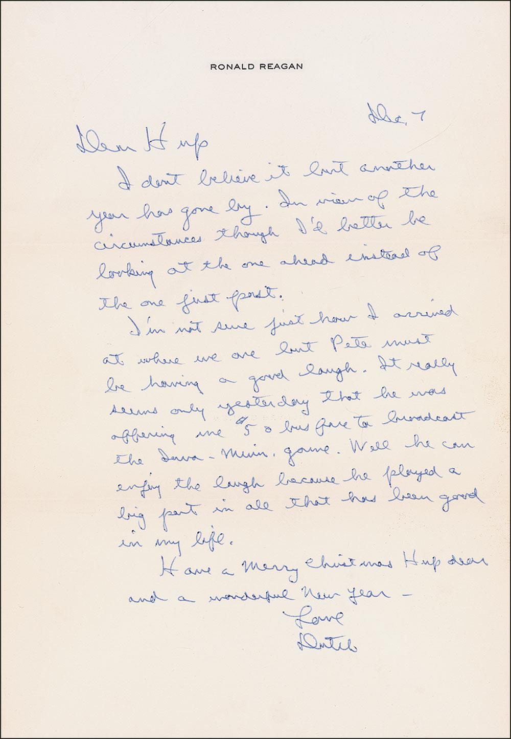 ALS signed “Dutch,” one page, 7.25 x 10.5, personal letterhead, December 7. Letter to his longtime friend Lydia “Hup” MacArthur. In full: “I don’t believe it but another year has gone by. In view of the circumstances though I’d better be looking at the one ahead instead of the one just past. I’m not sure just how I arrived at where we are but Pete must be having a good laugh. It really seems only yesterday that he was offering me $5 & bus fare to broadcast the Iowa-Minn. game. Well he can enjoy the laugh because he played a big part in all that has been good in my life. Have a Merry Christmas Hup dear and a wonderful New Year.” In fine condition, with a few small creases. Accompanied by the original mailing envelope, addressed in Reagan’s hand and postmarked December 8, 1975. Also accompanied by photocopies of a UPI article Pres. Reagan wrote, a page from TIME magazine’s January 5, 1981, Reagan Man of the Year issue mentioning Peter MacArthur, and a 1982 article about Hup MacArthur.