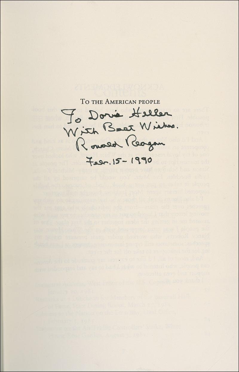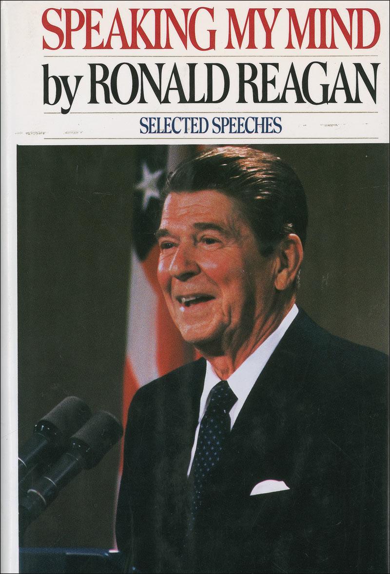 Signed book: Speaking My Mind. First edition, first printing. NY: Simon & Schuster, 1989. Hardcover with dustjacket, 6.5 x 9.5, 432 pages. Signed and inscribed on the dedication page, “To Doris Heller, With best wishes, Ronald Reagan, Feb, 15-1990.” In fine condition, with small ink mark to opening fore-edges, and some light edge wear and creases to dustjacket.