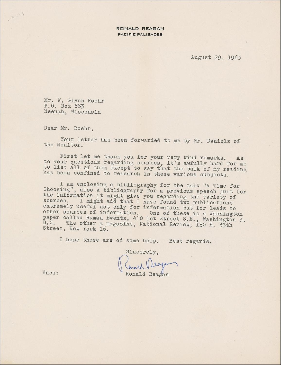 TLS, one page, 8.5 x 11, personal letterhead, August 29, 1963. Letter to Mr. W. Glynn Roehr, Neenah, Wisconsin, who had asked Whitman Daniels, editor of the Monitor, the bimonthly publication of Associated Industries of New York State, four questions relative to Reagan's ‘A Time for Choosing,’ an article published in the Monitor earlier that year. In part: “Your letter has been forwarded to me by Mr. Daniels of the Monitor…As to your questions regarding sources, it's awfully hard for me to list all of them except to say that the bulk of my reading has been confined to research in these various subjects. I am enclosing a bibliography for the talk 'A Time for Choosing' [not present]…I might add that I have found two publications extremely useful not only for information but for leads to other sources of information…a Washington paper called Human Events…a magazine, National Review…I hope these are of some help…” Accompanied by Daniels’ letter to Roehr as well as a copy of A Time for Choosing. Staple holes to upper left and a very faint, thin strip of central vertical toning, otherwise fine condition.