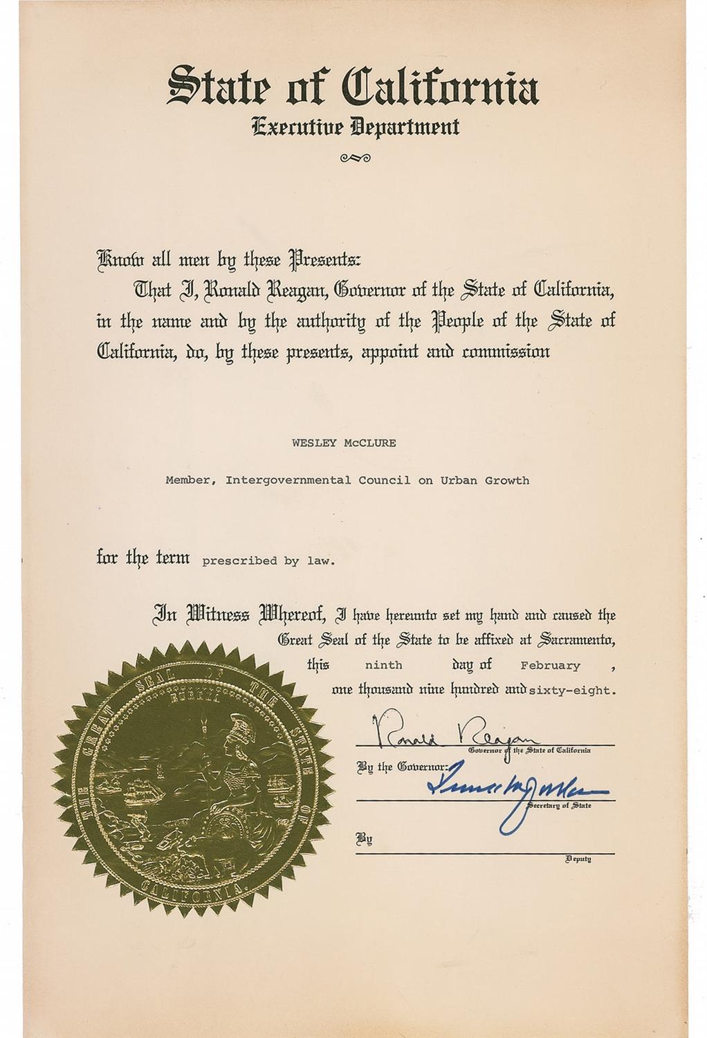DS, one page, 9 x 14, February 9, 1968. Governor Reagan appoints Wesley McClure a “Member, Intergovernmental Council On Urban Growth.” Signed at the conclusion by Reagan and countersigned by his secretary of state. In fine condition, with some mild toning, a bit heavier to edges. The gold foil seal is crisp and intact. Accompanied by a TLS from Reagan, signed in autopen, to McClure congratulating him on his re-appointment.