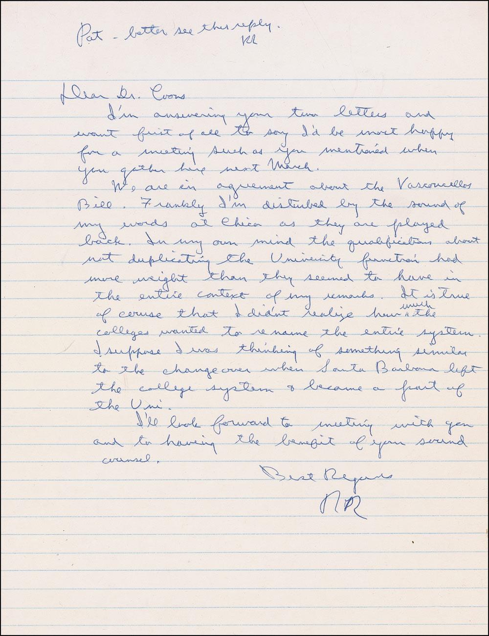 ALS signed “RR,” one page, lightly-lined, 8.5 x 11, no date. During his term as California governor, Reagan writes to a Dr. Coons. In full: “I’m answering your two letters and want first of all to say I’d be most happy for a meeting such as you mentioned when you gather here next March. We are in agreement about the Vasconcellos Bill. Frankly, I’m disturbed by the sound of my words at Chico as they are played back. In my own mind the qualifications about not duplicating the University function had more weight than they seemed to have in the entire context of my remarks. It is true of course that I didn’t realize how much the colleges wanted to rename the entire system. I suppose I was thinking of something similar to the changeover when Santa Barbara left the college system & became a part of the Uni. I’ll look forward to meeting with you and to having the benefit of your sound counsel.” He has also noted at the top of the page, “Pat—better see this reply. RR.” In fine condition. Interesting content about Reagan’s input into California colleges.