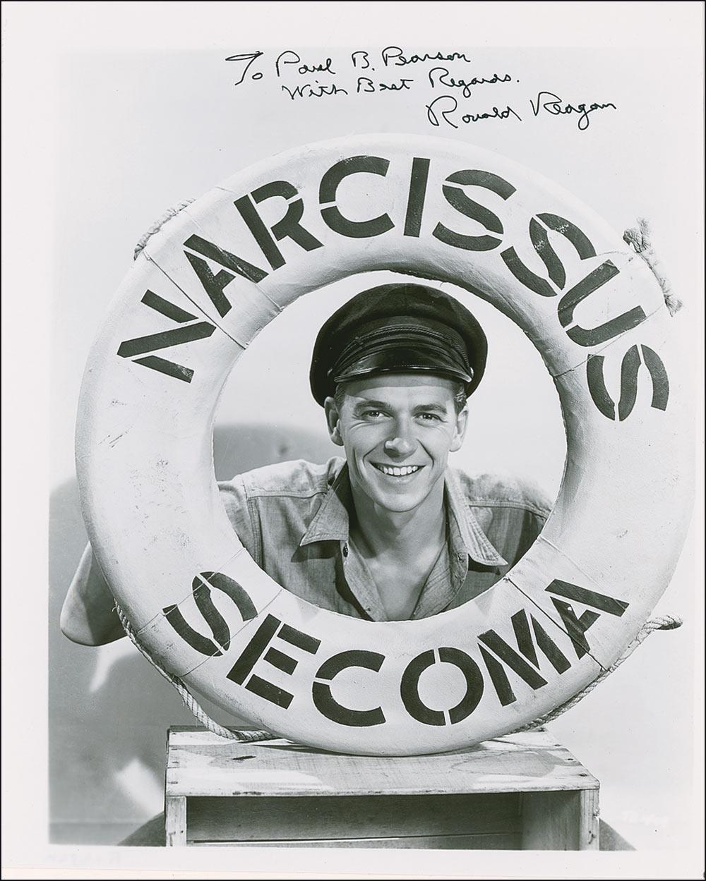 Glossy 8 x 10 photo of Reagan as Eddie Kent from the 1940 film Tugboat Annie Sails Again, signed and inscribed in black felt tip “To Paul B. Pearson, With best wishes, Ronald Reagan.” In fine condition, with a couple trivial edge creases.