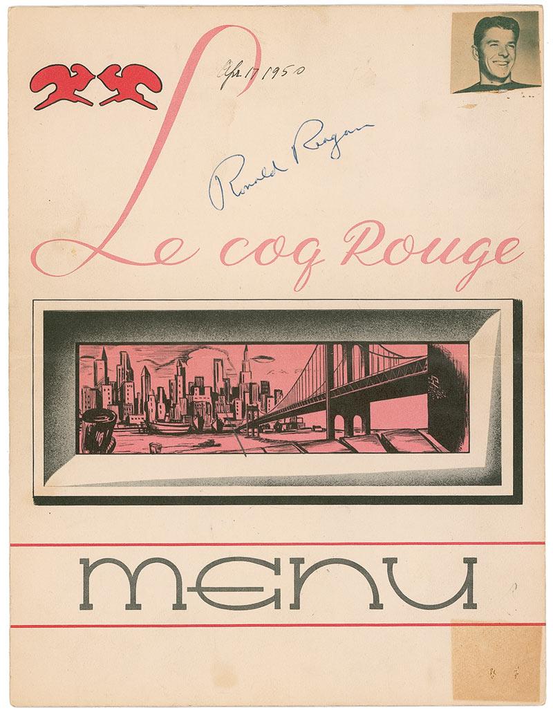 Supper menu from Le coq Rouge, 9.5 x 12.5, two pages, signed on the front cover in blue ballpoint. A small clipped photo of Reagan is affixed to top right of the cover, and also dated in another hand, “Apr. 17, 1950.” In very good condition, with a central horizontal fold, some scattered light soiling to covers, and a block of toning to lower right corner.