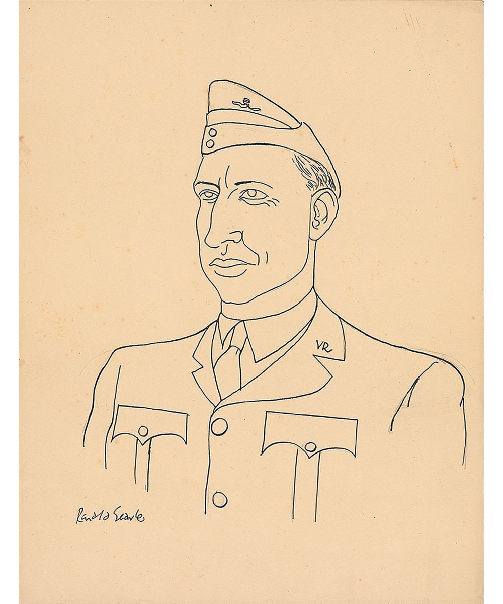 British satirical cartoonist (1920–2011) who provided illustrations for a number of newspapers, magazines, and books. Original signed ink sketch of a soldier on an off-white 7 x 9 sheet, signed in the lower left. Scattered foxing and toning, otherwise fine condition.