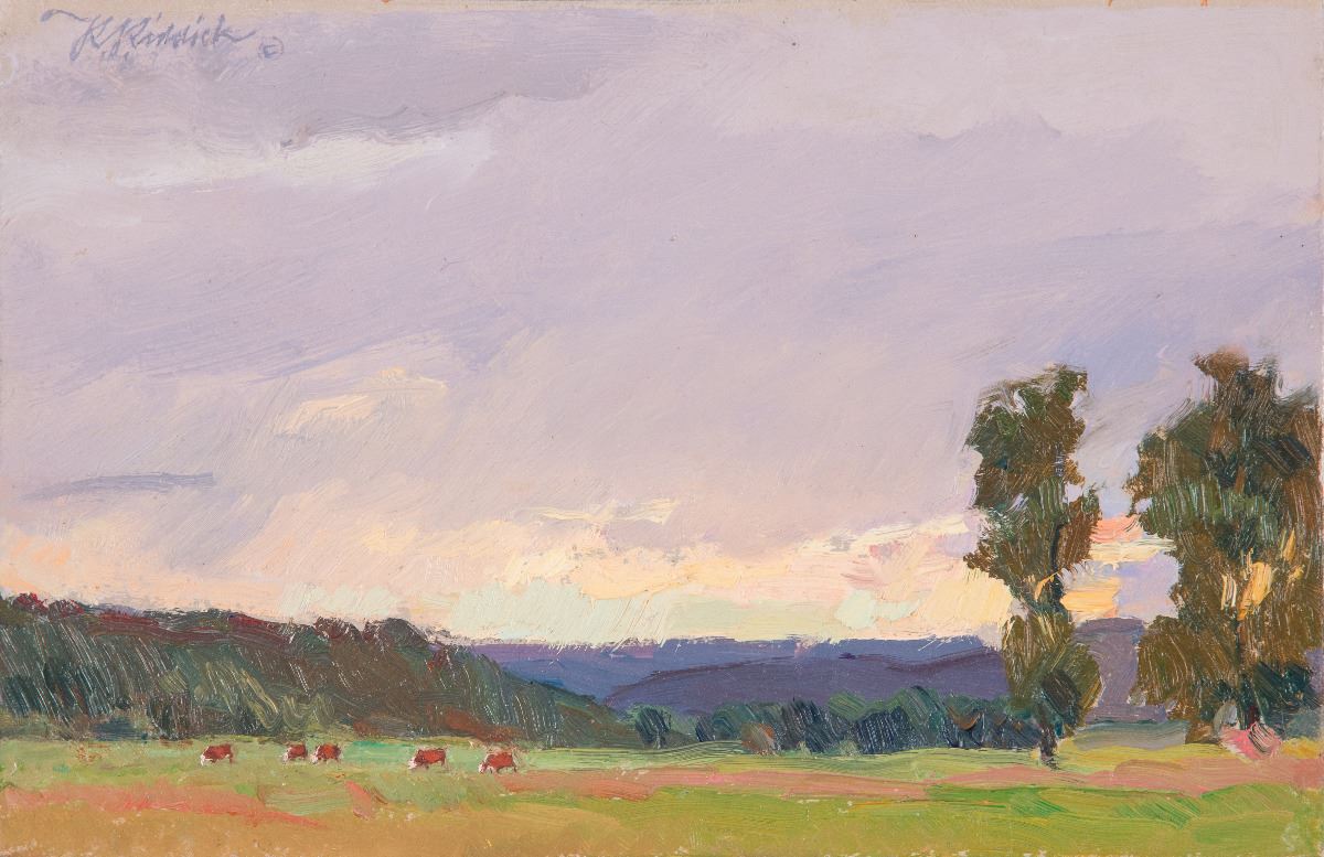 Ronald Stephen Riddick (1952 - ). Storm at Sunset. 5 ?" x 9" oil on board. Signed upper left. Verso: Titled, signed and dated 1993. "On location Steamboat Springs, CO 1992."