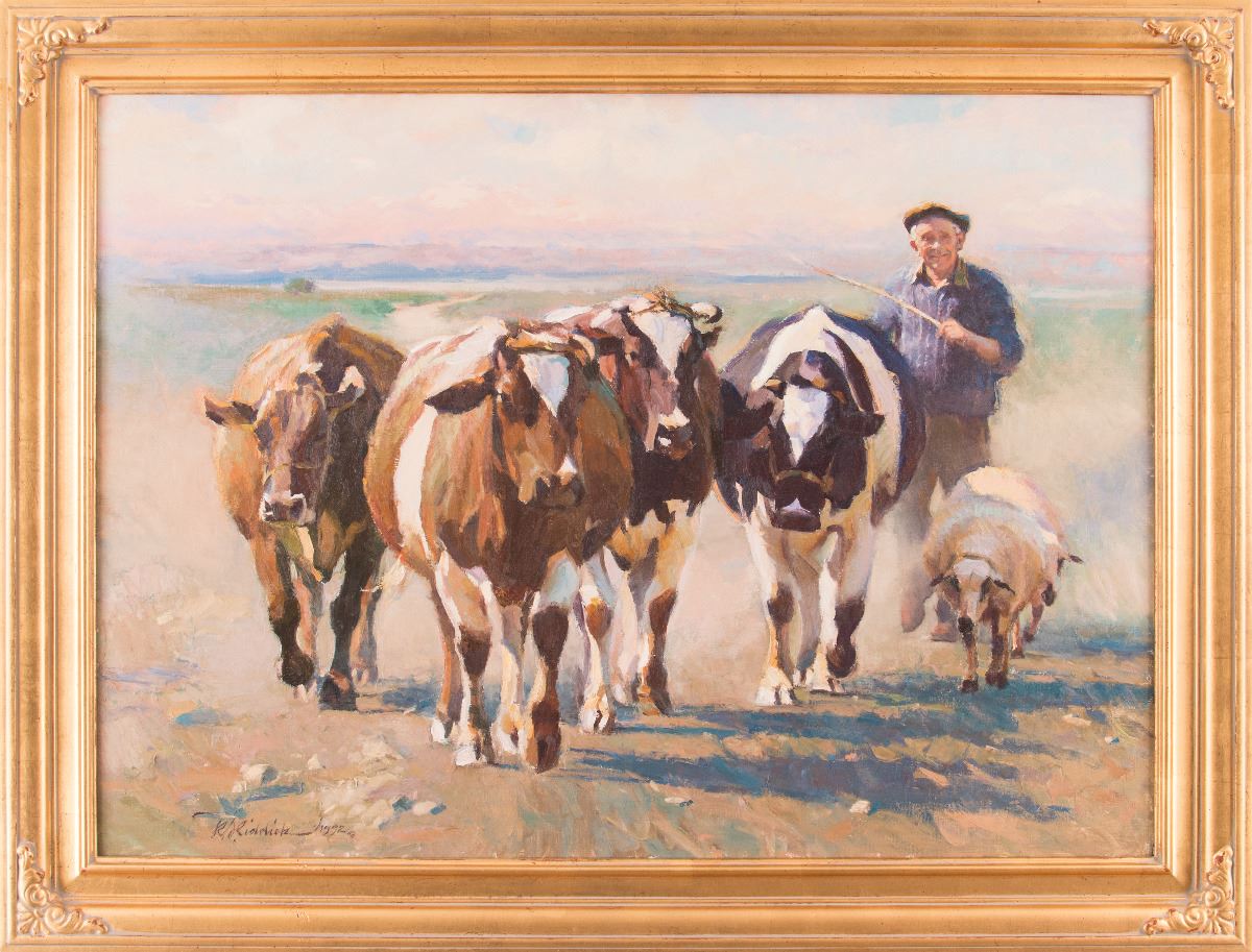 Ronald Stephen Riddick (1952 - ). The Road Home. 32" x 44" oil on canvas. Signed and dated 1992 lower left. Verso: Titled, signed and dated 1992.