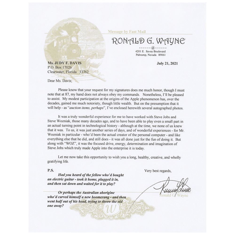 TLS, one page, 8.5 x 11, personal letterhead with embossed personal seal, July 21, 2021. Letter to Judy F. Davis, in part: "It was a truly wonderful experience for me to have worked with Steve Jobs and Steve Wozniak, those many decades ago, and to have been able to play even a small part in an actual turning point in technological historyalthough at the time, we none of us knew that it was. To us, it was just another series of days, and of wonderful experiencesfor Mr. Wozniak in particularwho'd been the actual creator of the personal computerand like everything else that he did, and still doesit was all done just for the fun of doing it. But along with 'WOZ,' it was the focused drive, energy, determination and imagination of Steve Jobs which truly made Apple into the enterprise it is today." In fine condition.