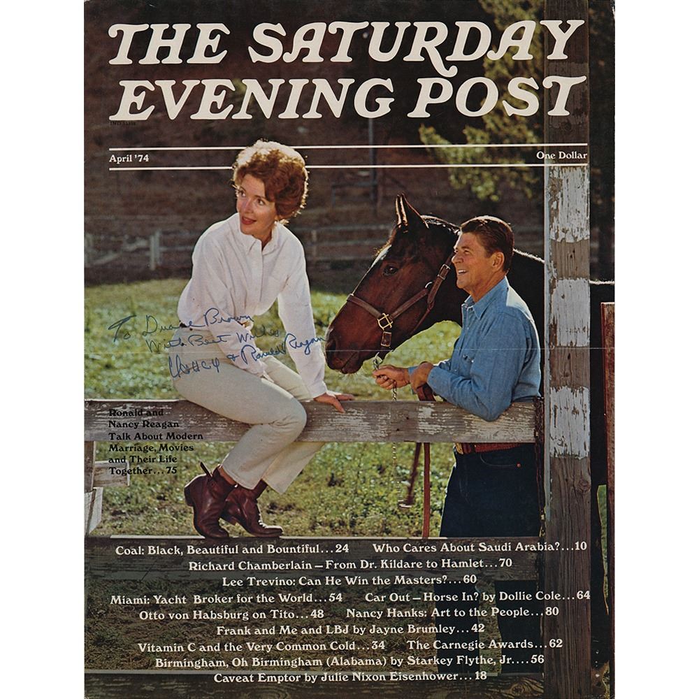 Front cover of The Saturday Evening Post from April 1974, 10.25 x 13, showing the Reagans at their Rancho del Cielo with the main cover line, “Ronald and Nancy Reagan Talk About Modern Marriage, Movies and Their Life Together,” signed and inscribed in blue felt tip, “To Duane Brown, with best wishes, Nancy” and “+ Ronald Reagan.” In fine condition, with a central horizontal mailing fold.