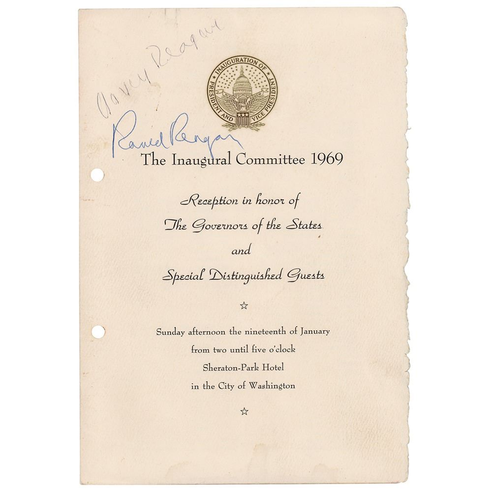 Program for the reception of governors associated with the 1969 inauguration of President Richard Nixon, 6.5 x 9.5, signed on the front cover in blue ballpoint, "Ronald Reagan" and "Nancy Reagan." In fine condition, with some faint stains, filing holes to left edge, and Nancy's signature a bit light but fully legible. A unique piece associating one Republican president with another.