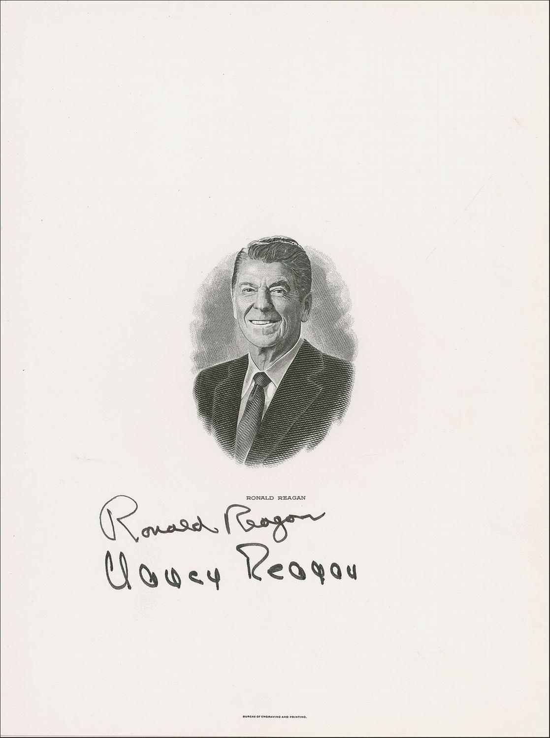 Detailed engraved portrait of the 40th president, 6 x 8, by the Bureau of Engraving and Printing, signed in black felt tip, “Ronald Reagan” and “Nancy Reagan.” In fine condition.