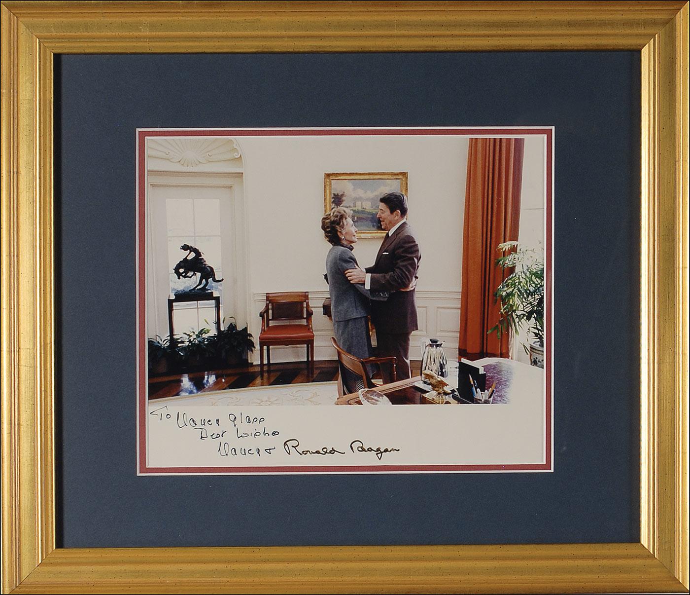 Color glossy 10 x 8 photo of the Reagans sharing a tender moment in the Oval Office, signed and inscribed in the lower border in black felt tip “To Nancy Glass, Best wishes, Nancy &” and “Ronald Reagan.” Double matted and framed to an overall size of 16 x 14. In fine condition.