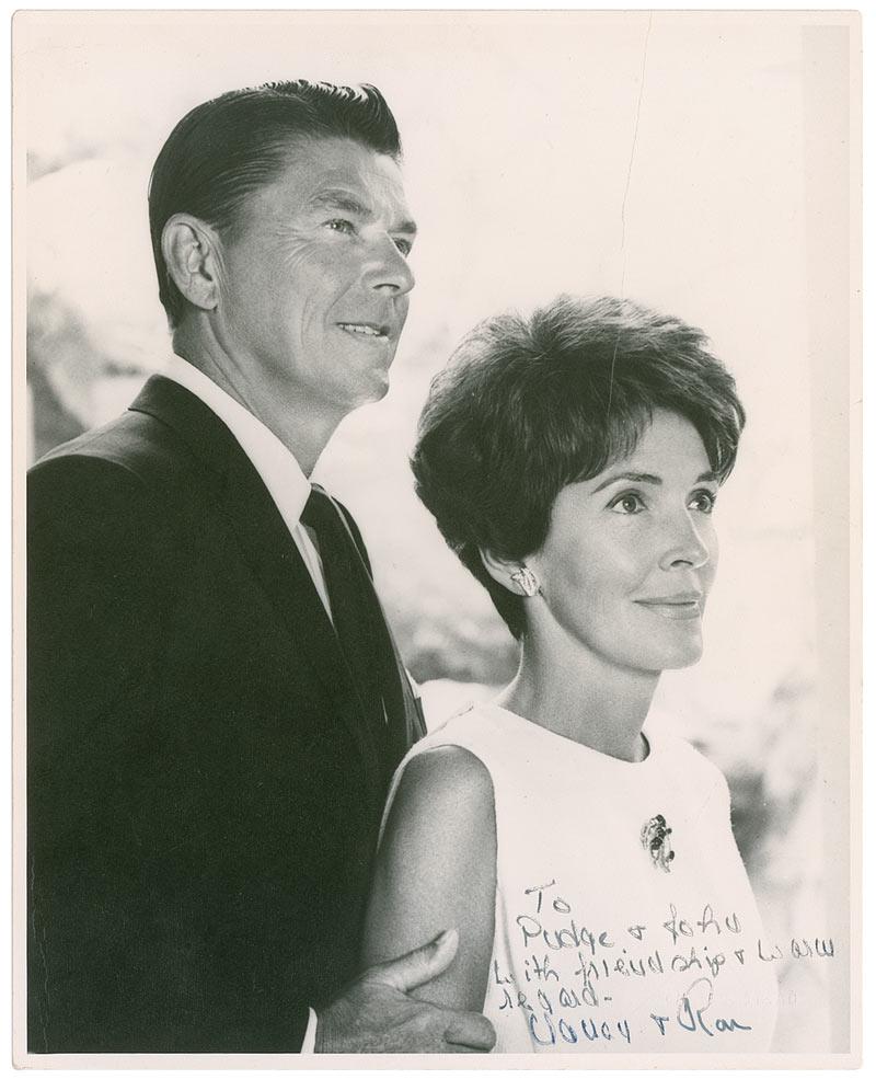 Vintage matte-finish 8 x 10 John Engstead portrait of Mr. and Mrs. Reagan, signed and inscribed in black felt tip “To Pudge & John, With friendship & warm regard—Nancy” with Reagan adding “& Ron.” In very good condition, with vertical crease crossing the top of Nancy’s hair and several smaller creases.