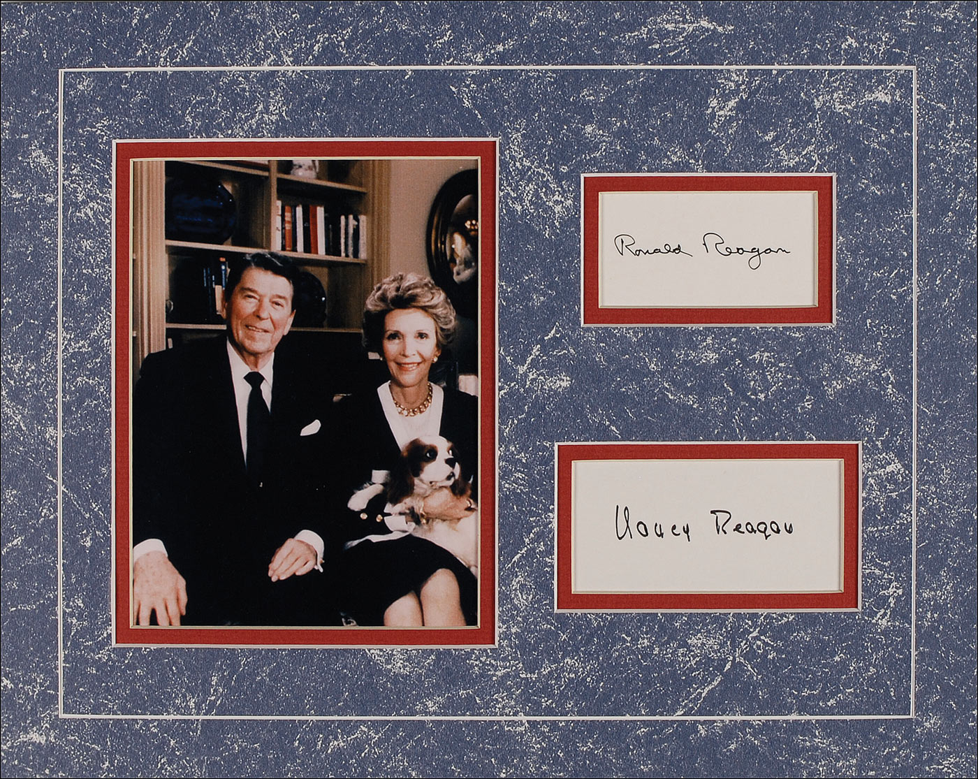 Felt tip signatures, “Ronald Reagan,” and “Nancy Reagan” on individual off-white cards. Both are double matted together with a photo of the Reagans in the White House to an overall size of 14 x 11. In fine condition.