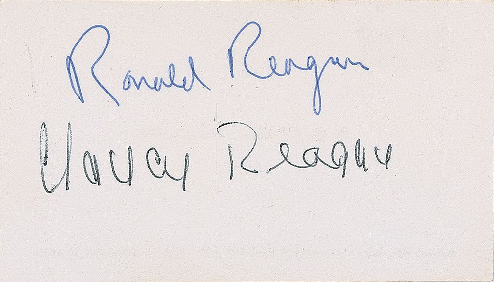Ballpoint signatures, “Ronald Reagan” and “Nancy Reagan,” on the reverse of an off-white 3.5 x 2 business card. In fine condition.
