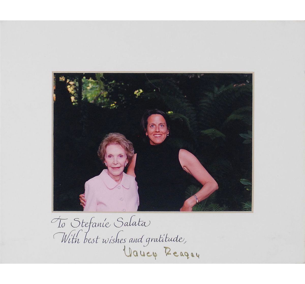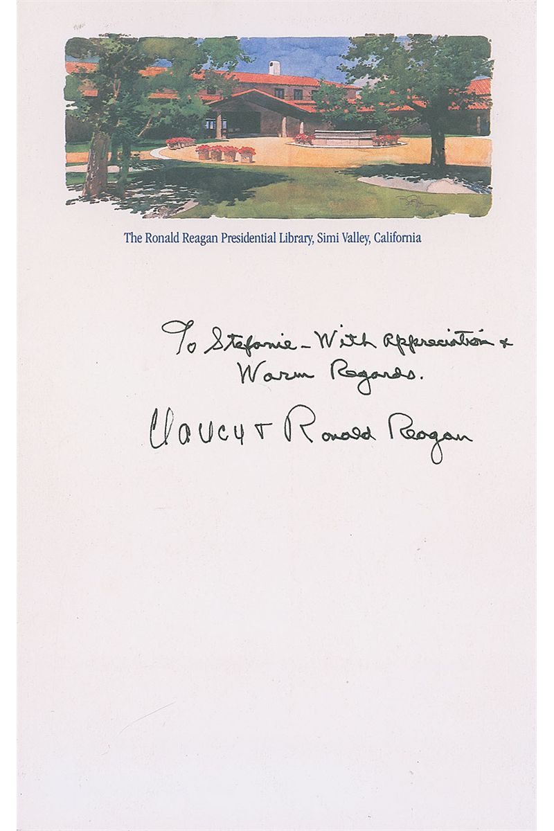 Felt tip signatures and inscription, “To Stephanie—With appreciation & warm regards, Ronald Reagan” and “Nancy,” on an off-white 6 x 9.5 stationery envelope featuring a color illustration of the Ronald Reagan Presidential Library. Also includes a color photo of the recipient with Nancy Reagan matted to an overall size of 10 x 8, inscribed in a calligraphic hand and signed in black felt tip by Nancy. In fine condition.