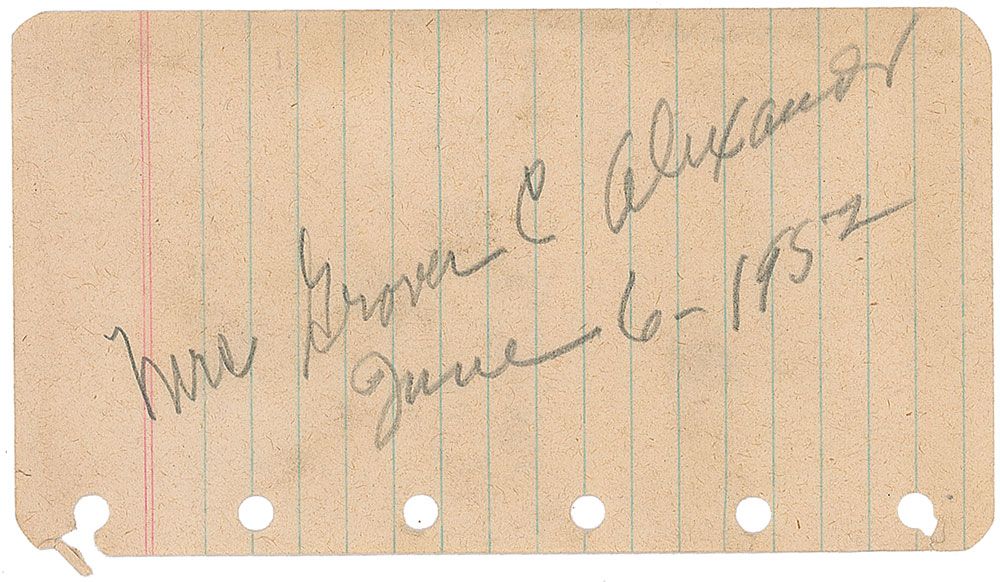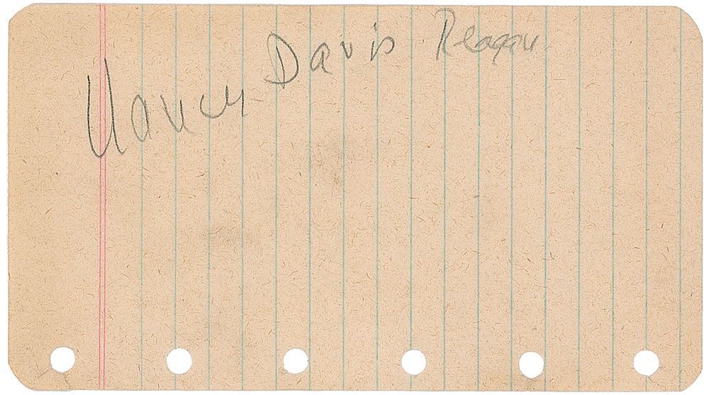 Vintage pencil signatures, “Ronald Reagan,” and “Nancy Davis Reagan,” on individual off-white 4.5 x 2.5 lined notebook pages. Also included is a vintage pencil signature, “Mrs. Grover C. Alexander, June 6–1952,” on a similar size sheet. In fine condition, with a uniform shade of mild toning to pages.