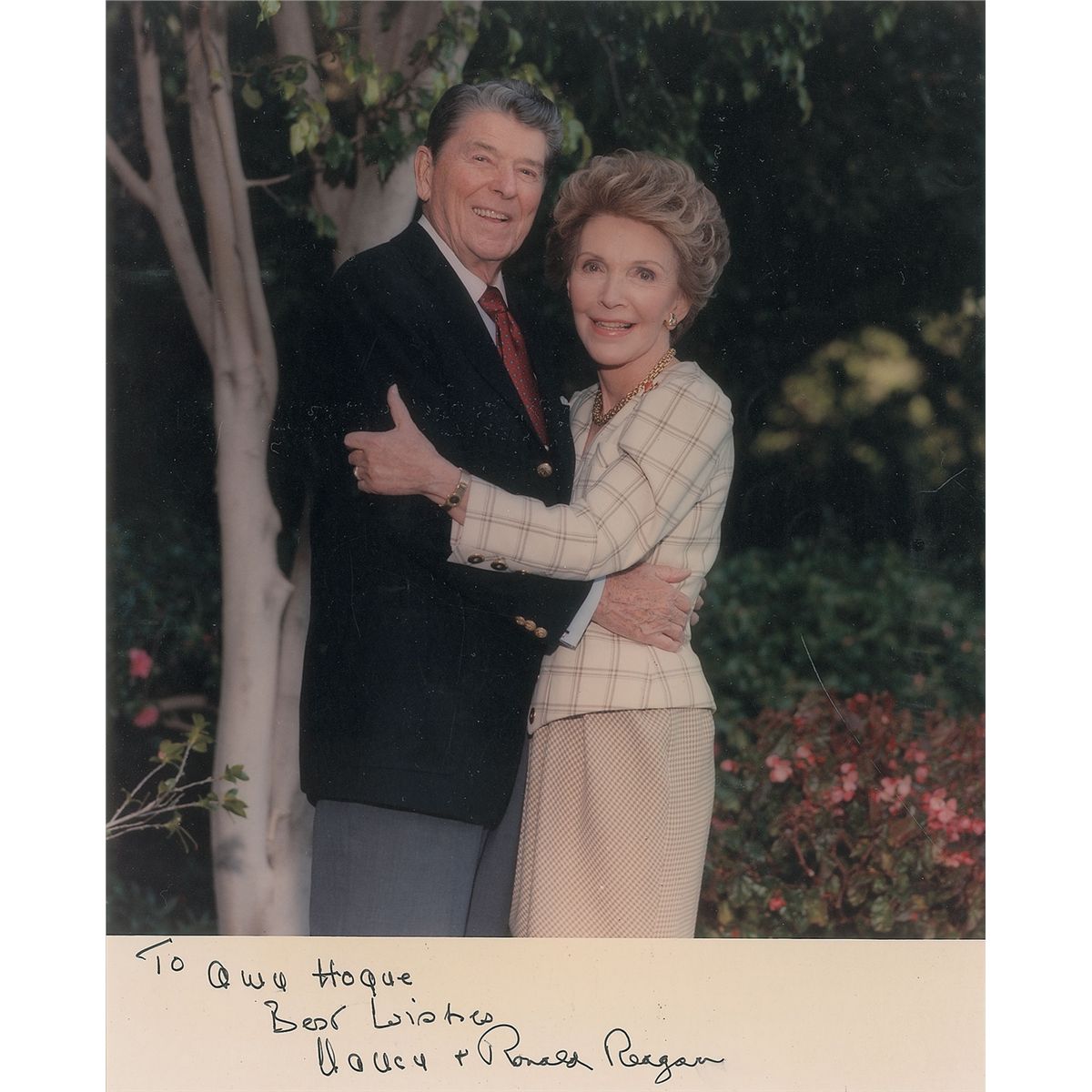Color satin-finish 8 x 10 photo of the couple together, signed and inscribed in black felt tip, “To Amy Hogue, Best wishes, Nancy” and “Ronald Reagan.” Moderate scattered creases and surface impressions, otherwise fine condition.