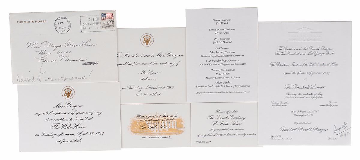 Three unsigned items: a partly-printed dinner invitation from “The President and Mrs. Reagan” for November 9, 1982; a printed invitation from “Mrs. Reagan” for a reception at the White House on April 28, 1987; and a printed invitation from “The President and Mrs. Ronald Reagan” for the President’s Dinner on May 16, 1985. In overall fine condition. Accompanied by an original transmittal envelope addressed in an unknown hand, an info card for the President’s dinner, a social secretary response card, and a White House visitor’s entrance card.