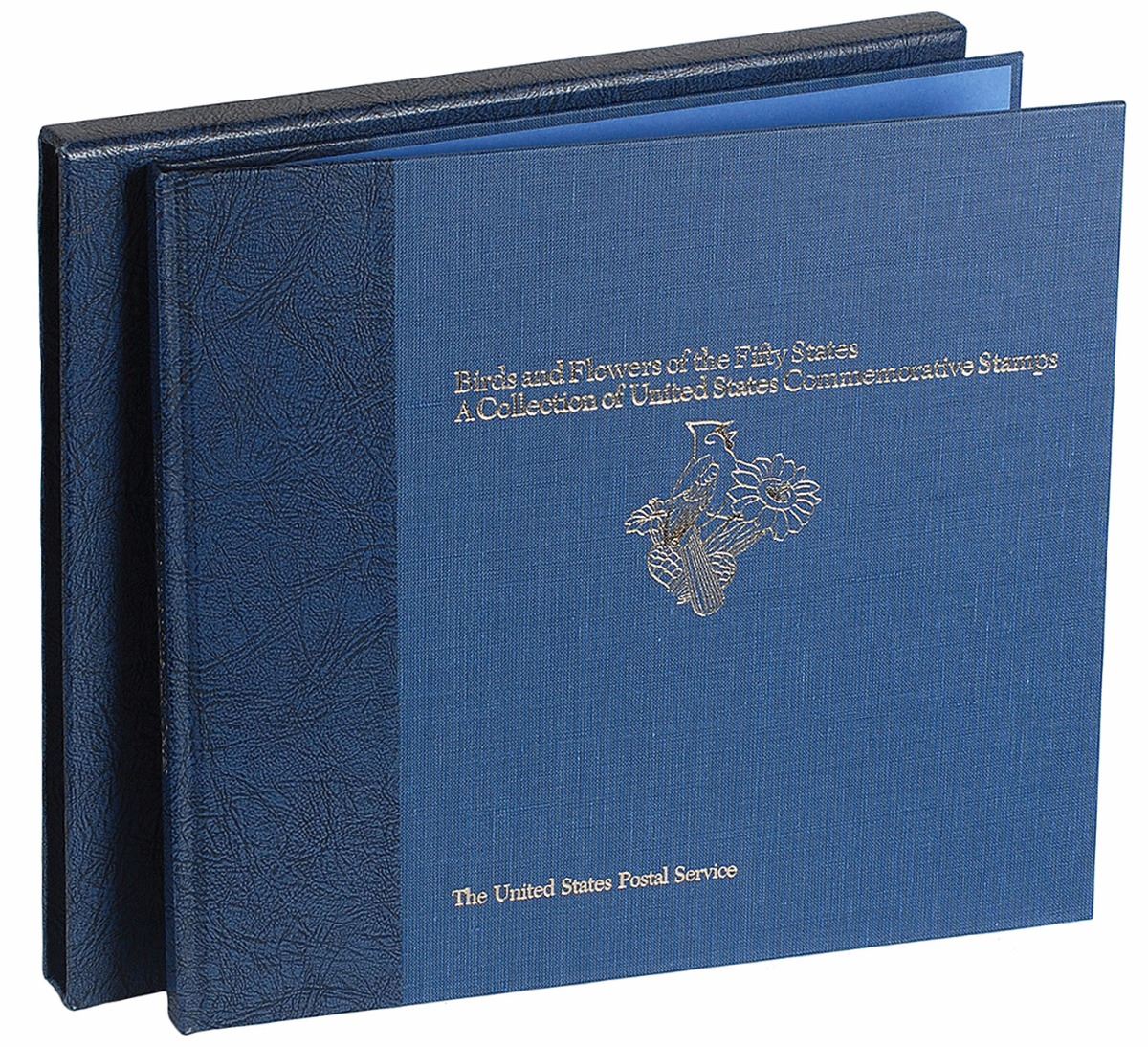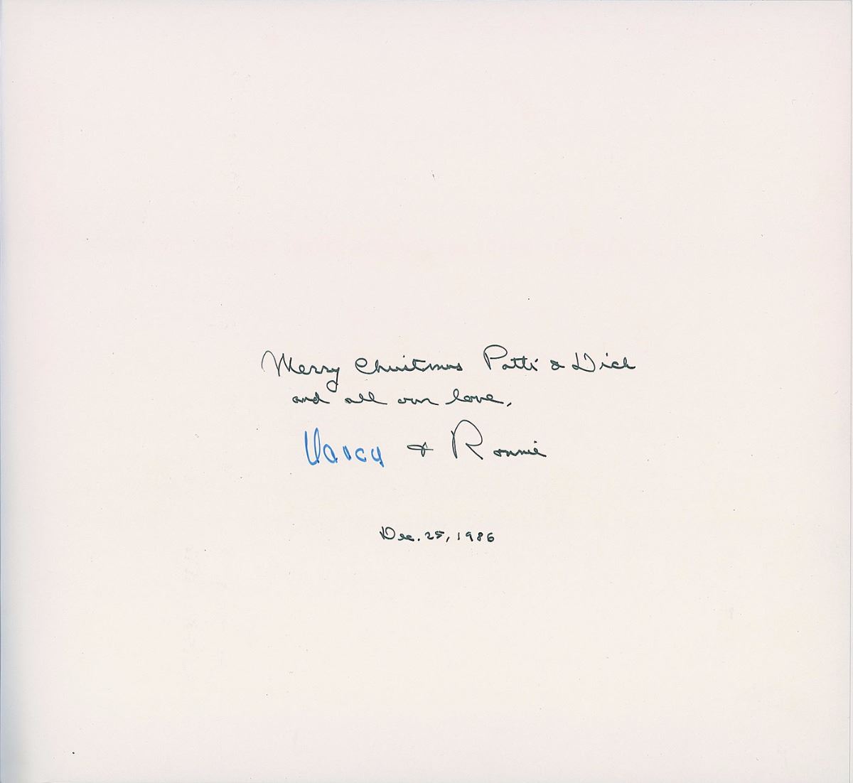 Signed book: Birds and Flowers of the Fifty States: A Collection of United States Commemorative Stamps. Washington, D.C.: U. S. Postal Service, 1982. Leatherbound hardcover with slipcase, 12.75 x 11.75, 59 pages. Signed and inscribed on the first free end page in black ink, “Merry Christmas Patti & Dick, and all our love…& Ronnie, Dec. 25,1986,” and in blue felt tip, “Nancy.” Edition includes a full block of all fifty state stamps. In very fine condition. A wonderfully patriotic book gifted from one presidential couple to another.