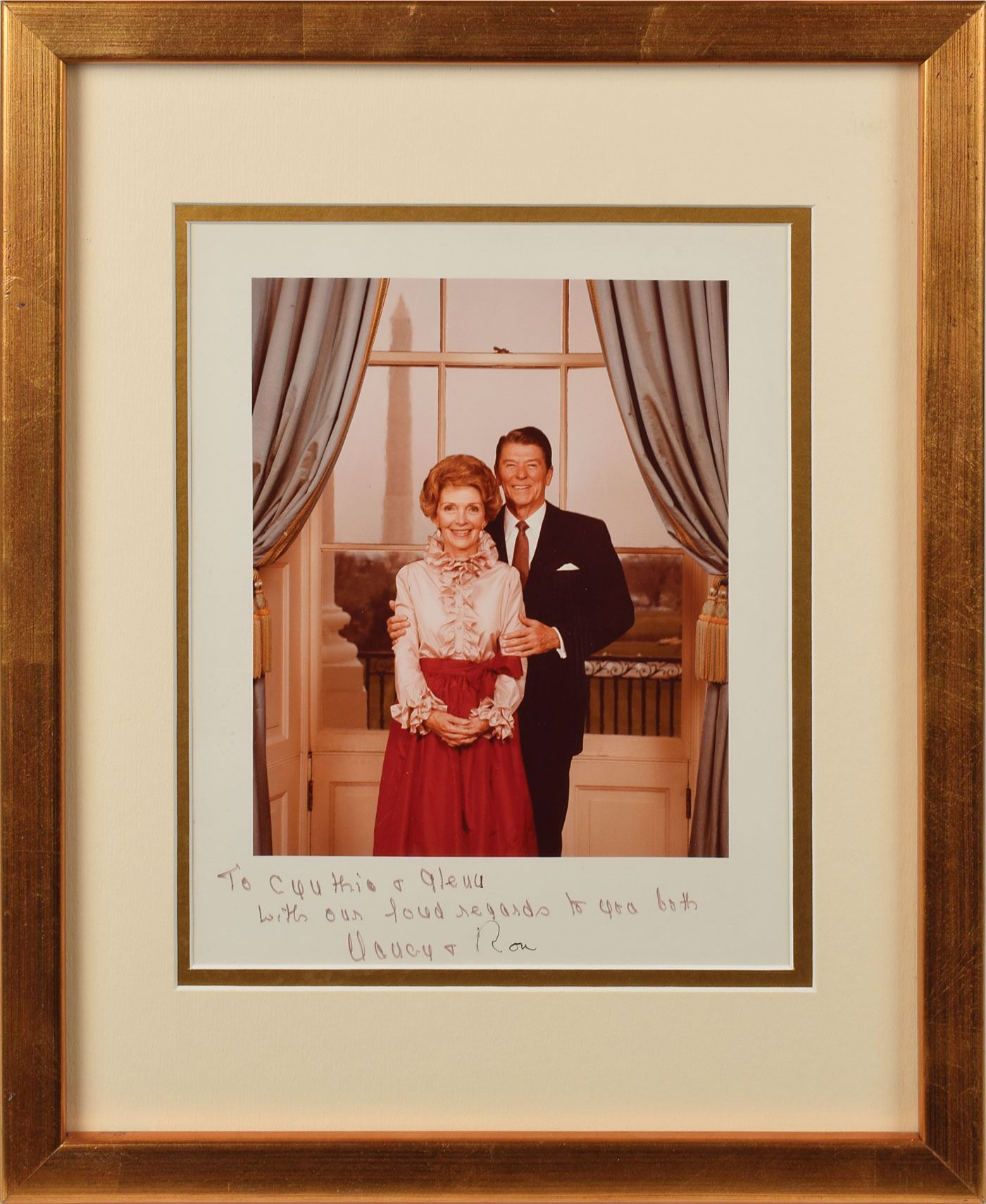Color satin-finish 7.5 x 9.5 three-quarter-length photo of President Reagan and the First Lady, signed and inscribed to actor Glenn Ford and his wife in black felt tip, "To Cynthia & Glenn, with our find regards to you both, Nancy &" and "Ron.” Nicely double-matted and framed to an overall size of 12.25 x 15.25. In fine condition. Accompanied by a letter of provenance signed by Ford's son, Peter.
