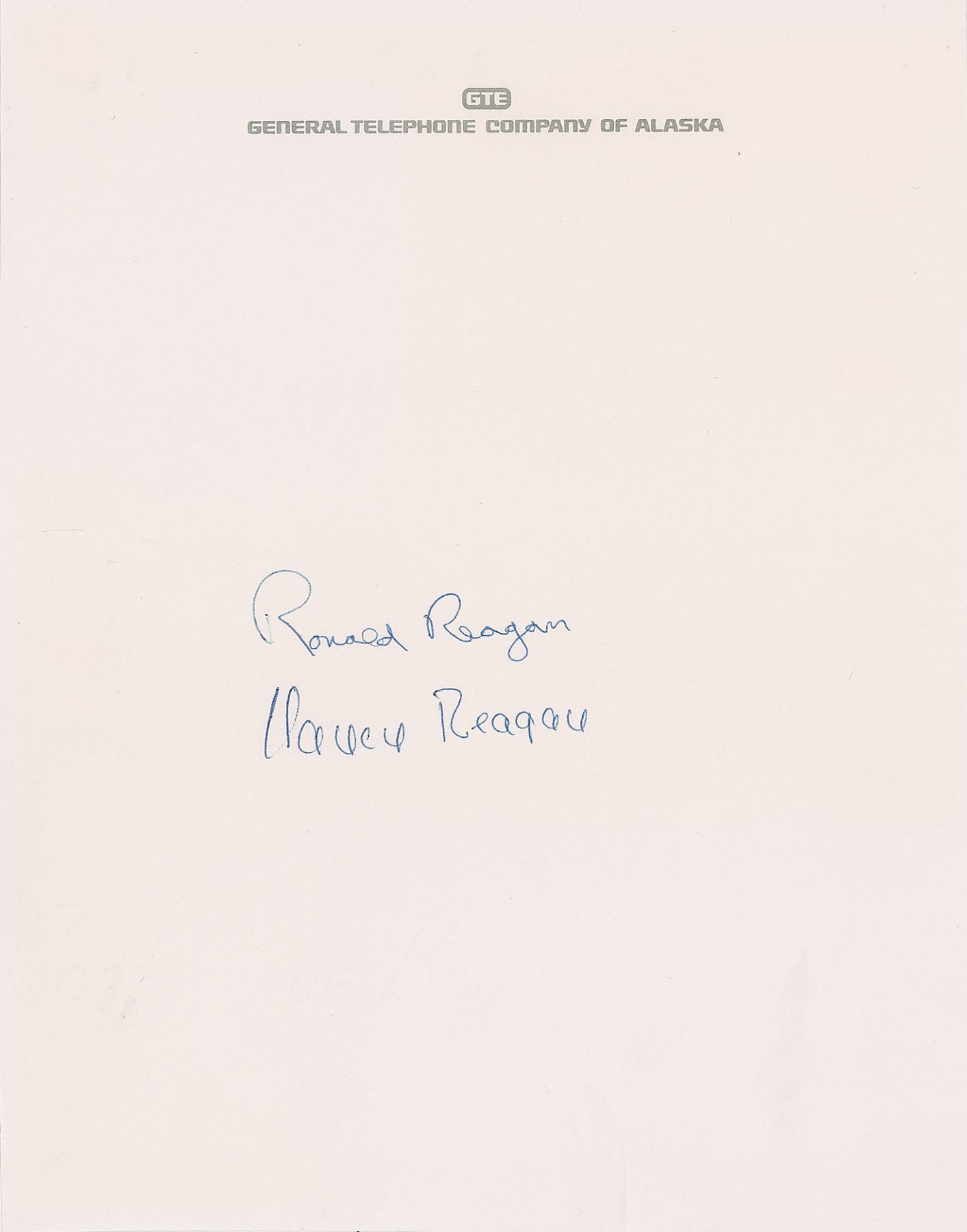 Ballpoint signatures, "Ronald Reagan" and "Nancy Reagan,” on an off-white 8 x 10 sheet of General Telephone Company of Alaska stationery. In fine condition.