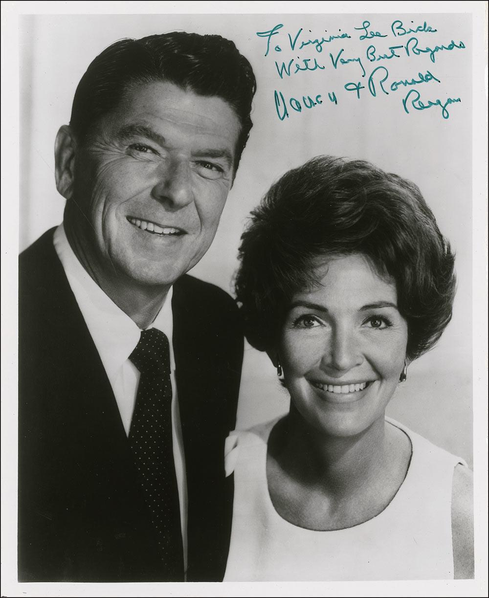 Vintage glossy 8 x 10 photo of the Reagans, signed and inscribed in green felt tip “To Virginia Lee Bick, With very best regards, Ronald Reagan” with Nancy signing in front of her husband’s signature. In fine condition, with some scattered light creasing and edge wear. Pre-certified PSA/DNA and RRAuction COA.