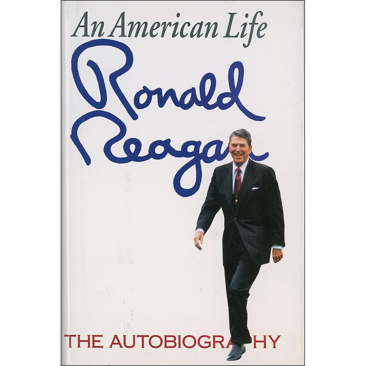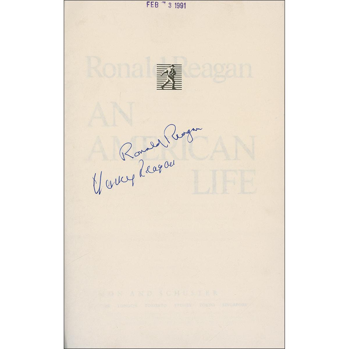 Signed book: An American Life. First edition, first printing. NY: Simon & Schuster, 1990. Hardcover with dustjacket, 6.5 x 9.5, 748 pages. Signed on the second free end page in blue ink by both “Ronald Reagan” and “Nancy Reagan.” Signed page is also date-stamped February 3, 1991. In fine condition, with owner’s stamp to top edge, price clip to inside of dustjacket, and some light wear and rubbing to dustjacket.