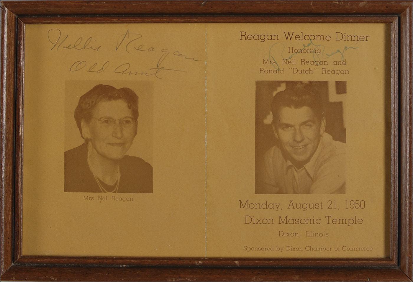Vintage program for the Reagan Welcome Dinner, honoring Ronald and Nell Reagan, held at the Dixon Masonic Temple in Dixon, Illinois, on August 21, 1950, measuring 8 x 5 opened, signed on the front cover in blue ink by Ronald Reagan and on the back cover in pencil, “Nellie Reagan, Old Aunt.” Framed to an overall size of 9 x 6. In fine condition, with some light creases and handling wear, and a uniform shade of toning. Located on the Rock River, Dixon was the boyhood home of Reagan. In his teen years, Reagan lifeguarded along the banks of the Rock River. His family house is preserved at 816 South Hennepin Avenue, and authorized by Congress to become Ronald Reagan Boyhood Home National Historic Site.