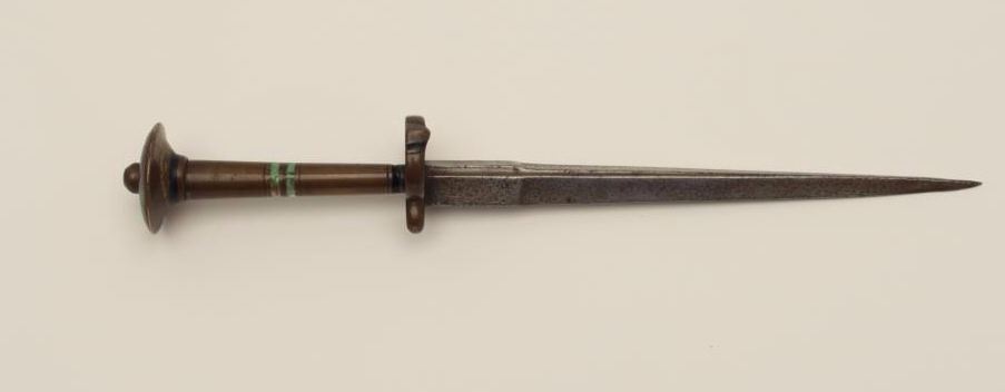 Rondell Dagger 15th to 16th Century, style possibly French. Approx. 12" overall with 7 7/8" triangular shaped reinforced blade for piercing. Early enamel inlay in light green and blue color with traces of 'fire gilt'Good condition with dark patina on hilt showing small losses to enamel. Light to moderate pitting on blade. Definately antique with experts differing on whether period or Victorian. We and several outside expertsfeel period 1450-1550. 30 day full right of return privilege for buyer inspection on this lot. Est.$3,000-6,000