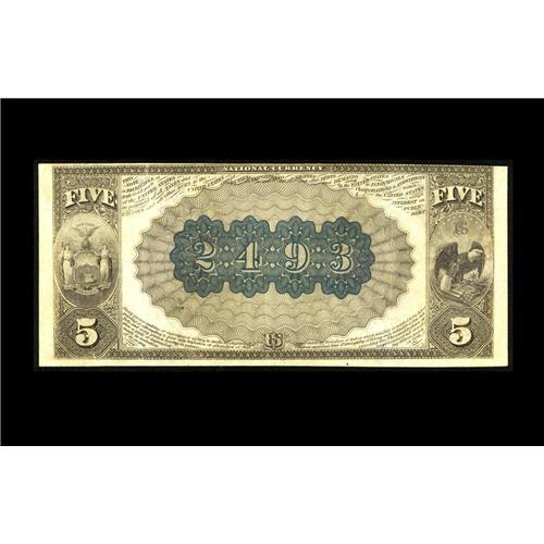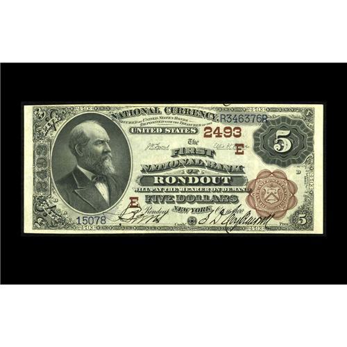 <B>Rondout, NY</B></I> - $5 1882 Brown Back Fr. 477 <B>The First NB</B></I> Ch. # (E)2493<BR>A lovely $5 Brown Back which is as nice as any note we've seen or heard of from this Ulster County bank. Pen signed <B>Extremely Fine-About Uncirculated.</B></I>