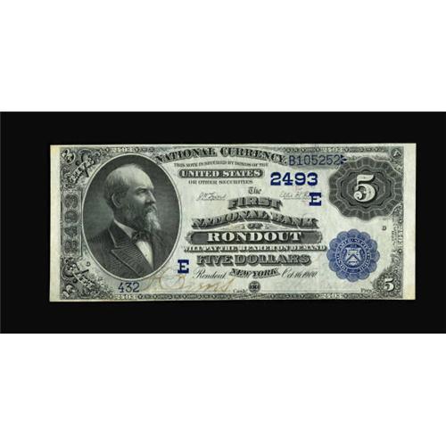<B>Rondout, NY</B></I> - $5 1882 Date Back Fr. 537 <B>The First NB</B></I> Ch. # (E)2493<BR> A lovely example which is perfect for type. Tom obtained this note from our old friend Frank Nowak, whose fixed price lists under the rubric "The Vault" from the seventies and eighties are much missed. Bright <B>Extremely Fine.</B></I><BR><I>From The Thomas A. Bergin Collection</B></I><BR><BR><b>Shipping:</b> Coins & Currency (<a target="_blank" href="http://www.heritageauctions.com/common/shipping.php">view shipping information</a>)