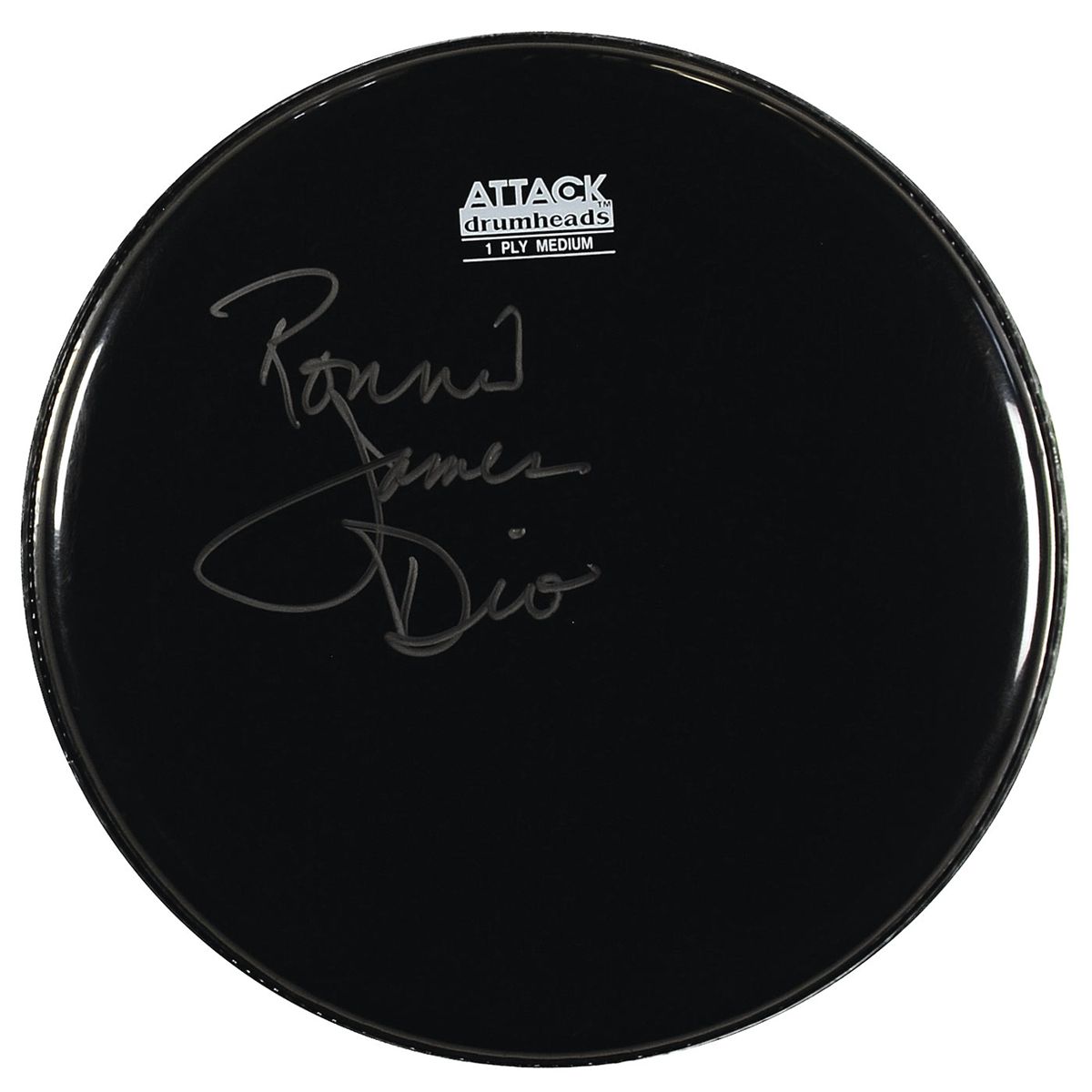 Unused 10? black Attack drumhead, signed in silver ink, “Ronnie James Dio.” In fine condition.