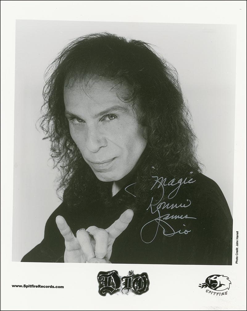 Satin-finish 8 x 10 publicity photo of the heavy metal legend, signed in silver ink, “Magic. Ronnie James Dio.” In fine condition.