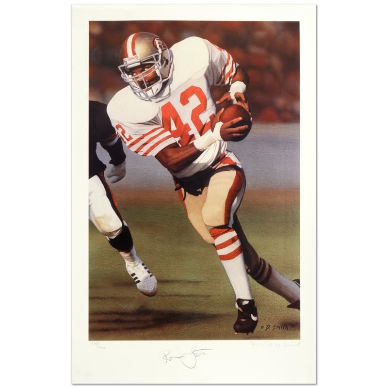 "Ronnie Lott" is a limited edition lithograph on paper dated (1990) by Daniel M. Smith, numbered and hand signed by both the artist and Ronnie Lott! Includes Certificate of Authenticity! Measures approx. 14" x 21.5" (with border), 12" x 18" (image).