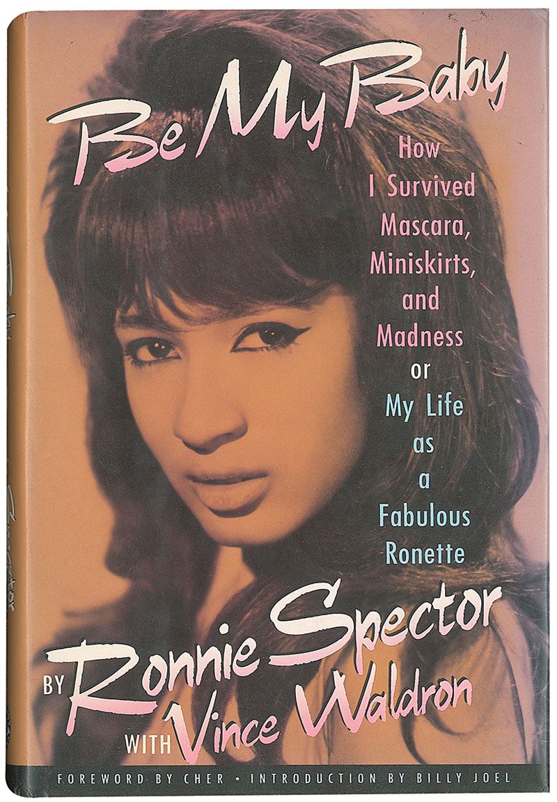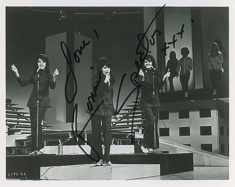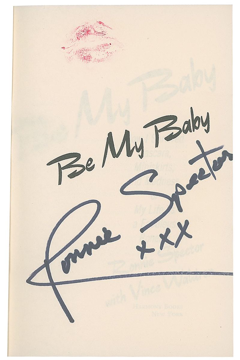 Two items: one glossy 10 x 8 photo of The Ronettes performing, signed in black felt tip, “Love, Ronnie Spector xxx”; and one hardcover first edition of Be My Baby signed on the half-title page in black felt tip, “Ronnie Spector, xxx,” along with a lipstic